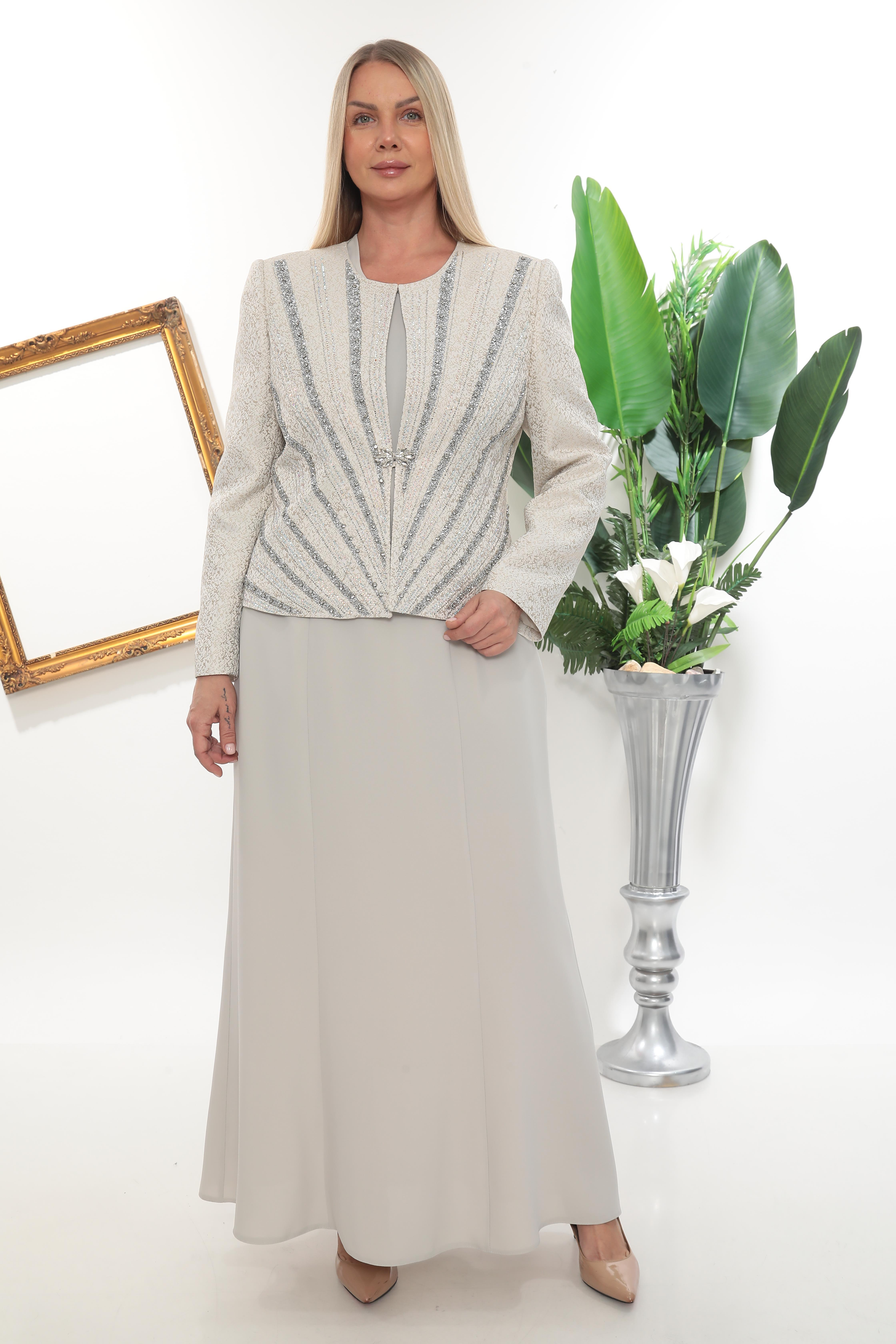 Şerit Taş İşlemeli Astarlı Ekru Uzun Etekli 3'lü Takım (3225Ee)