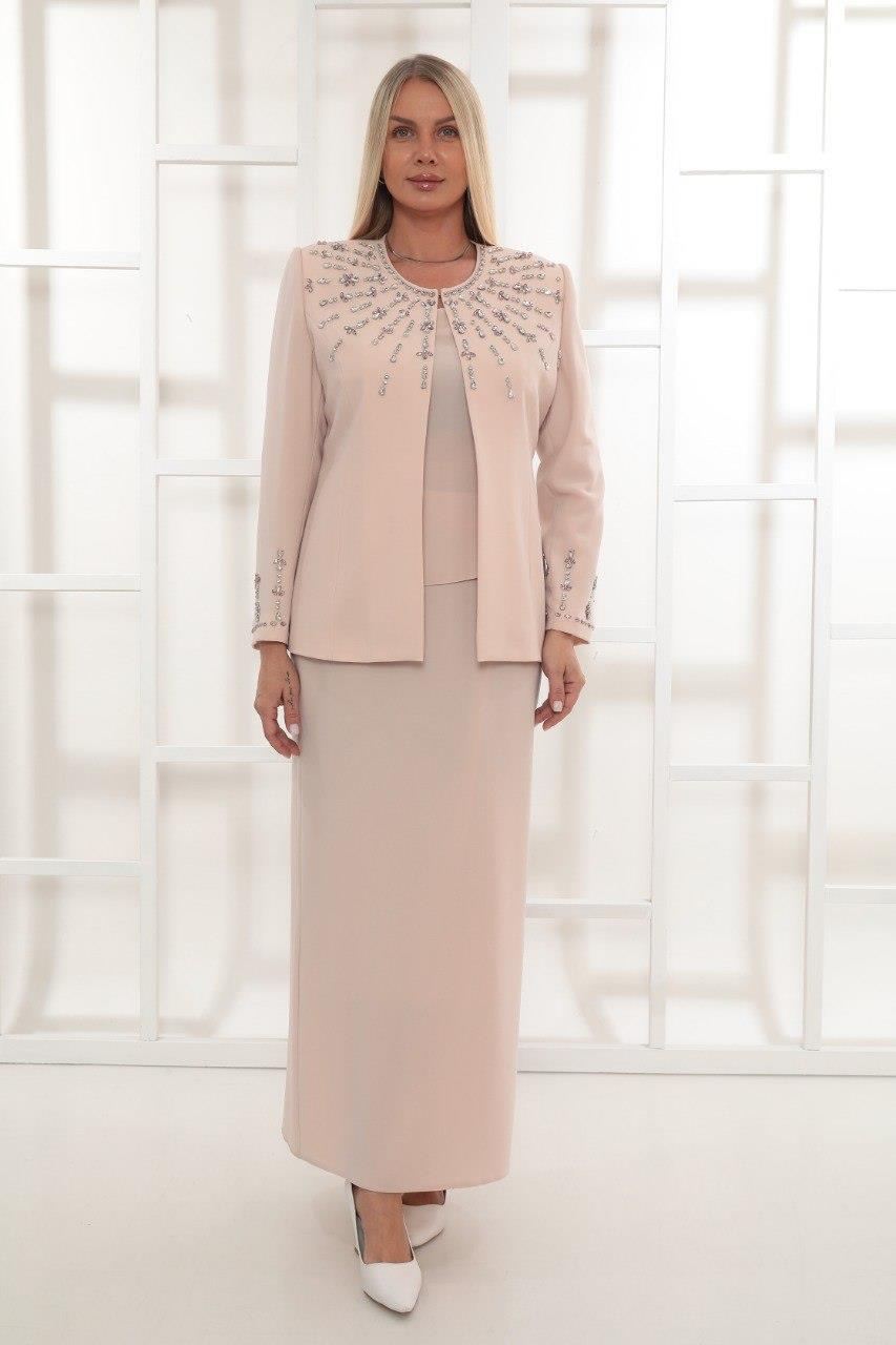 Ceketi Şık Taş İşlemeli Pudra Uzun Etekli Üçlü Takım (1611P-Yeni)