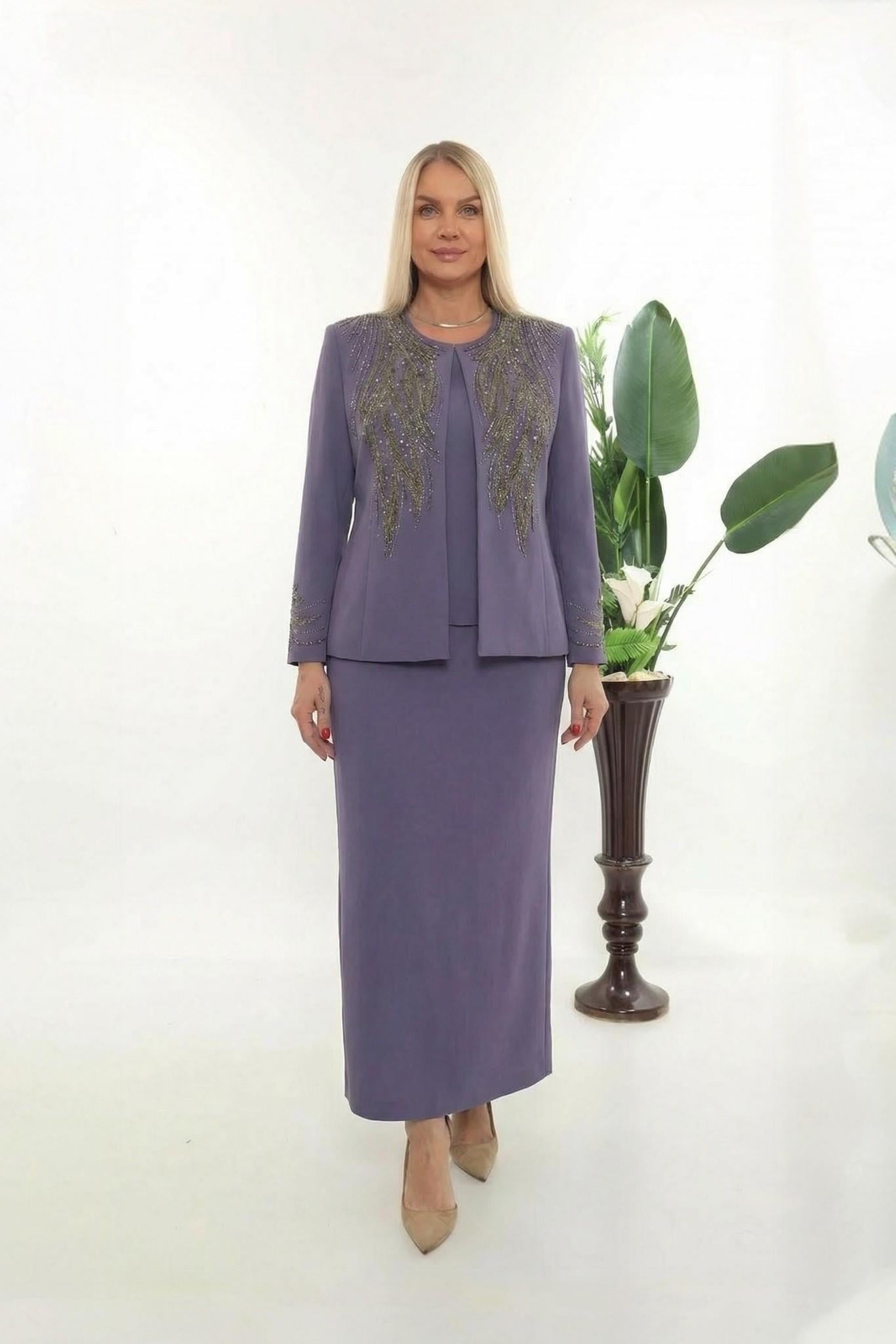Mürdümün Zarafeti, Omuzdan İnen Işıltılı Nakışlar - Bu mürdüm tonlarındaki üçlü takım, pürüzsüz dokulu lüks kumaşı üzerine omuz hattından aşağı süzülen yoğun dal formundaki kristal taş işlemeleriyle dikkat çeken görkemli bir tasarımdır. Kol manşetlerindeki ince işleme detayları, takımla mükemmel uyum sağlayan iç bluzu ve klasik kesim uzun eteğiyle oluşan bu set; düğünlerden en seçkin davetlere kadar her anınızda kusursuz bir asalet sunacak.