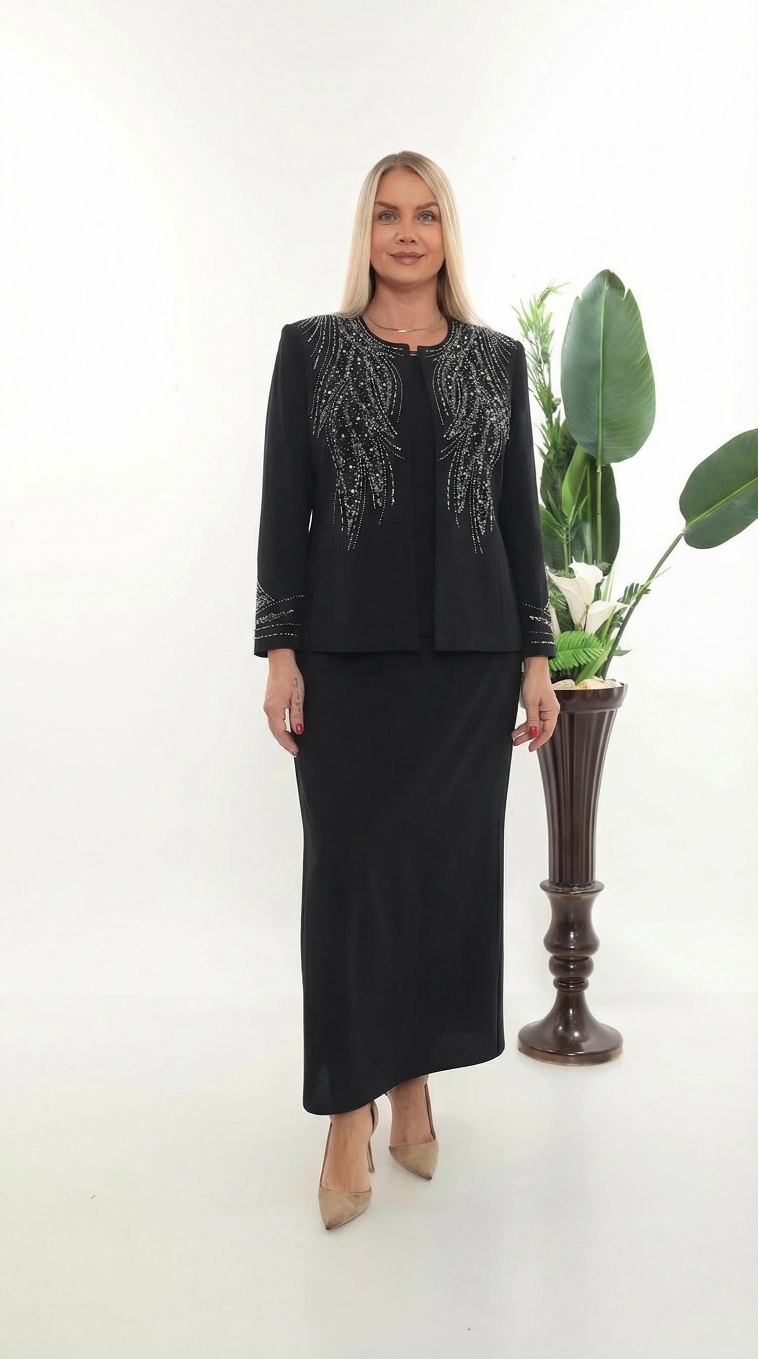 Siyahın Zarafeti, Omuzdan İnen Işıltılı Nakışlar - Bu siyah tonlarındaki üçlü takım, pürüzsüz dokulu lüks kumaşı üzerine omuz hattından aşağı süzülen yoğun dal formundaki kristal taş işlemeleriyle dikkat çeken görkemli bir tasarımdır. Kol manşetlerindeki ince işleme detayları, takımla mükemmel uyum sağlayan iç bluzu ve klasik kesim uzun eteğiyle oluşan bu set; düğünlerden en seçkin davetlere kadar her anınızda kusursuz bir asalet sunacak.