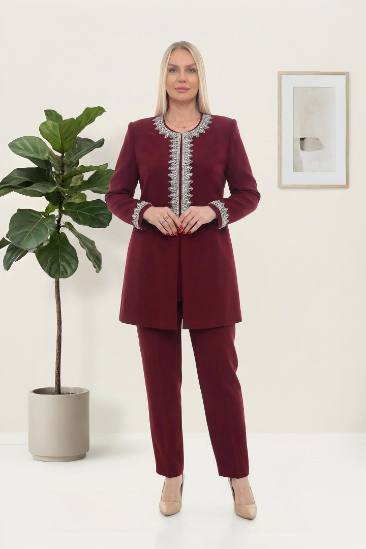 Ceket Önü Zarif Taş İşlemeli Bordo Üçlü Pantolonlu Takım (1703K)