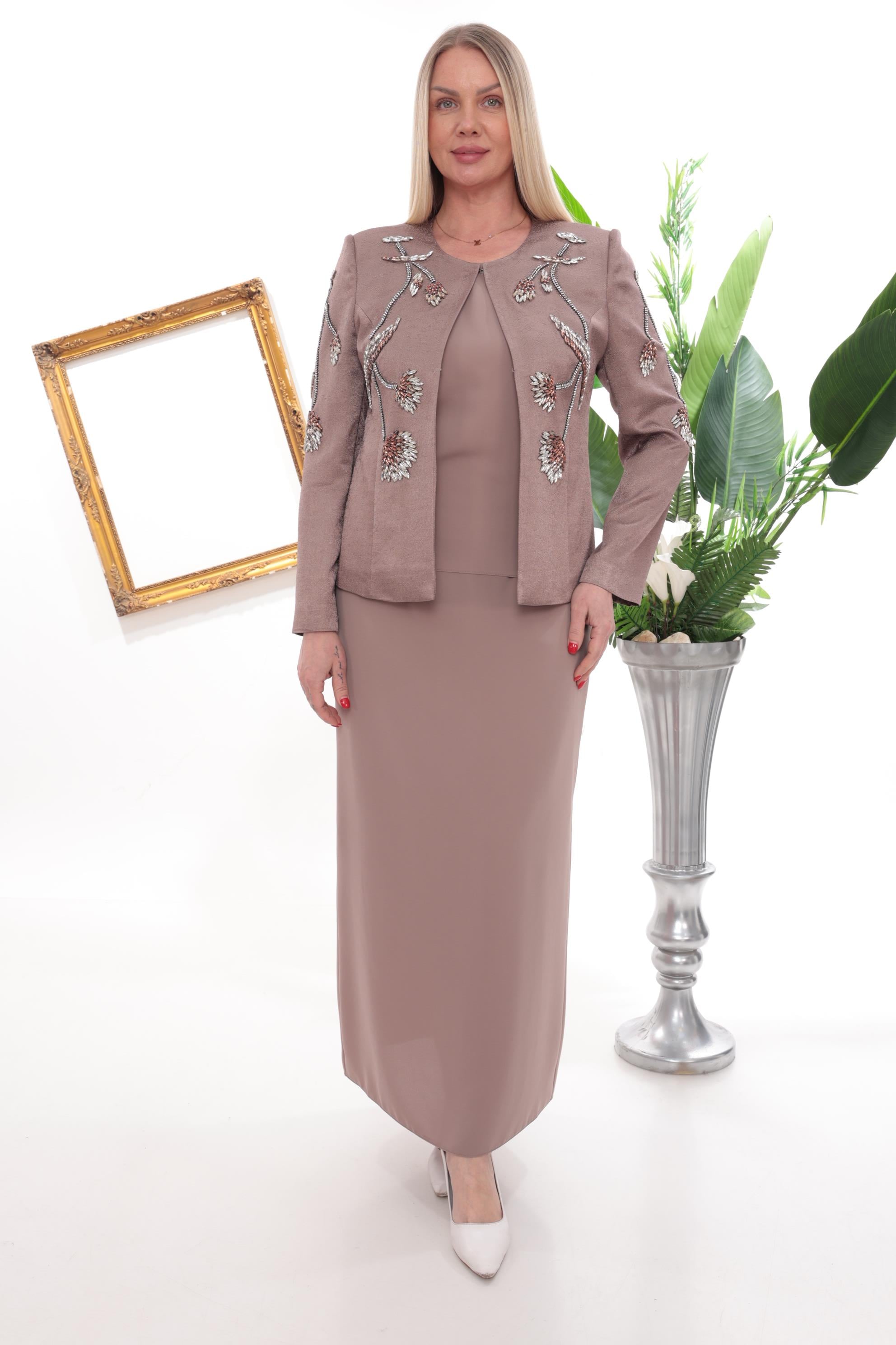 Tasarım: Kristal taşlı dal çiçek motifli, kiremit ceket, iç bluz ve etekten oluşan üçlü takım.