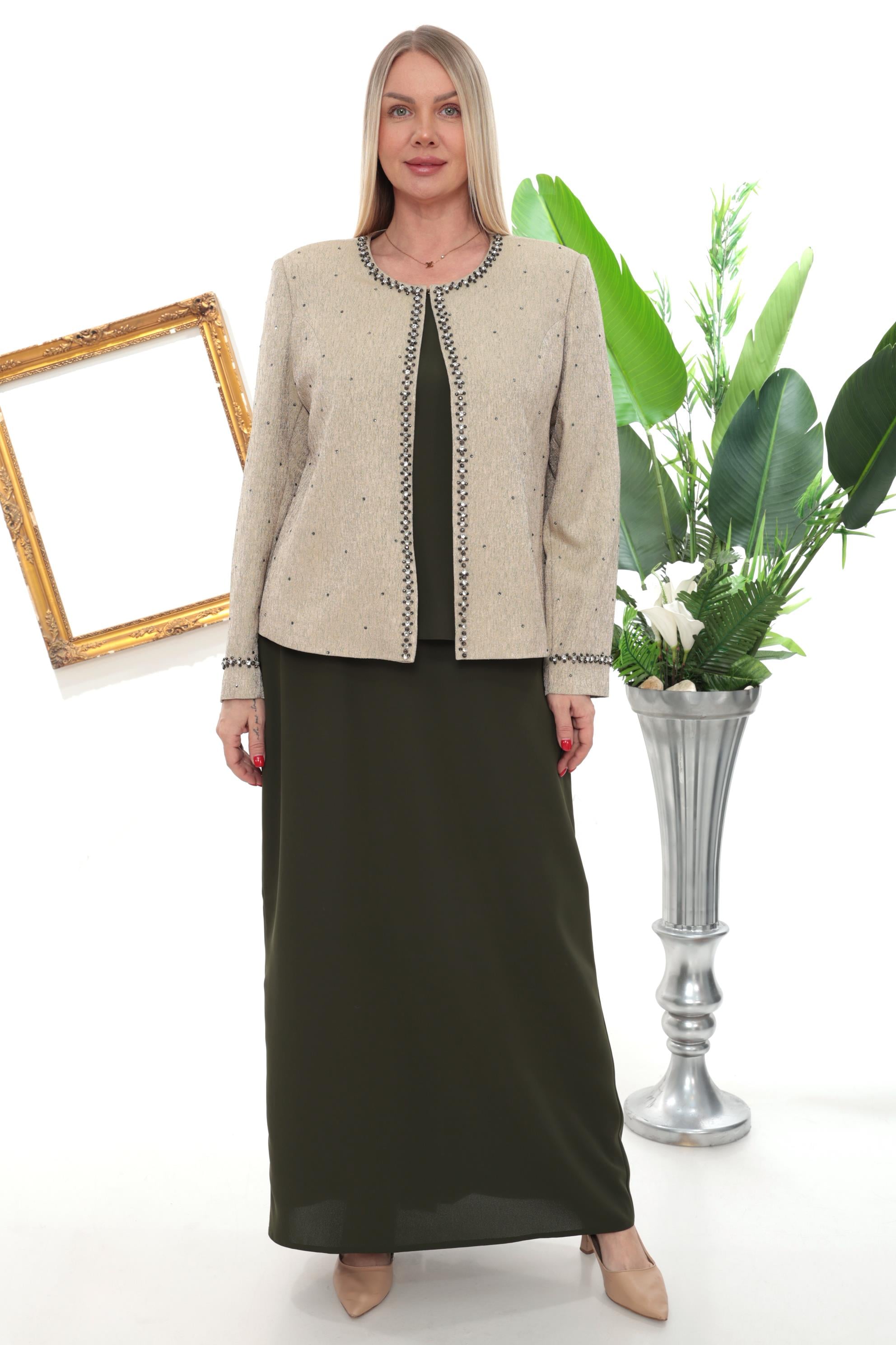 Ceketi Hafif Taş İşlemeli Büyük Beden Haki Uzun Etekli Üçlü Takım
