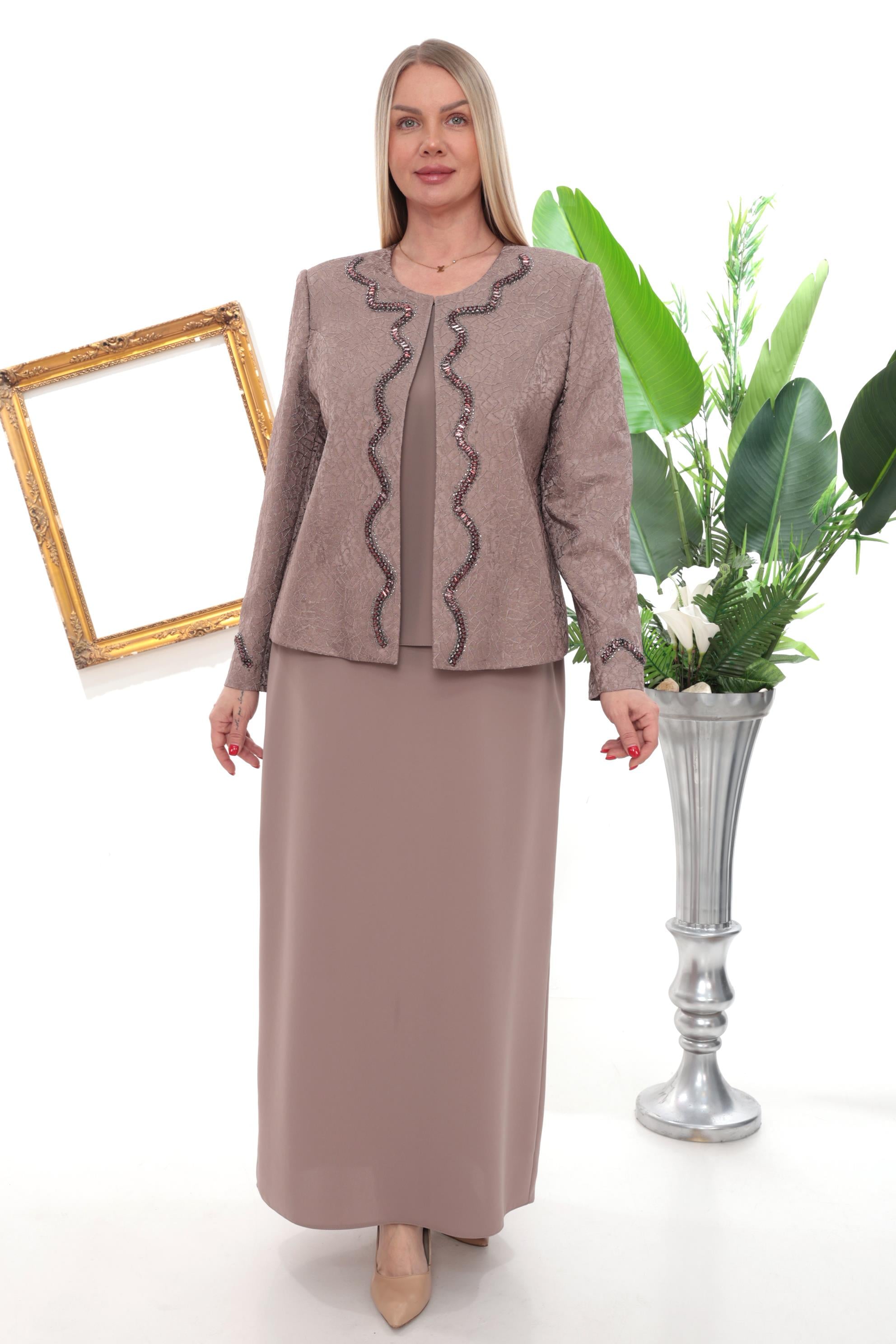 Ceketi Şerit Taş Detaylı Kahverengi Uzun Etekli Üçlü Takım (L4240KH)