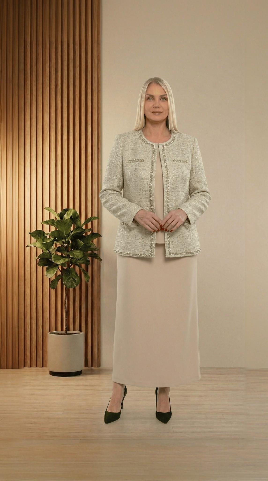 Ceketi Şık Jakar Dokumalı Taşlı Bej Uzun Etekli Üçlü Takım (121B)
