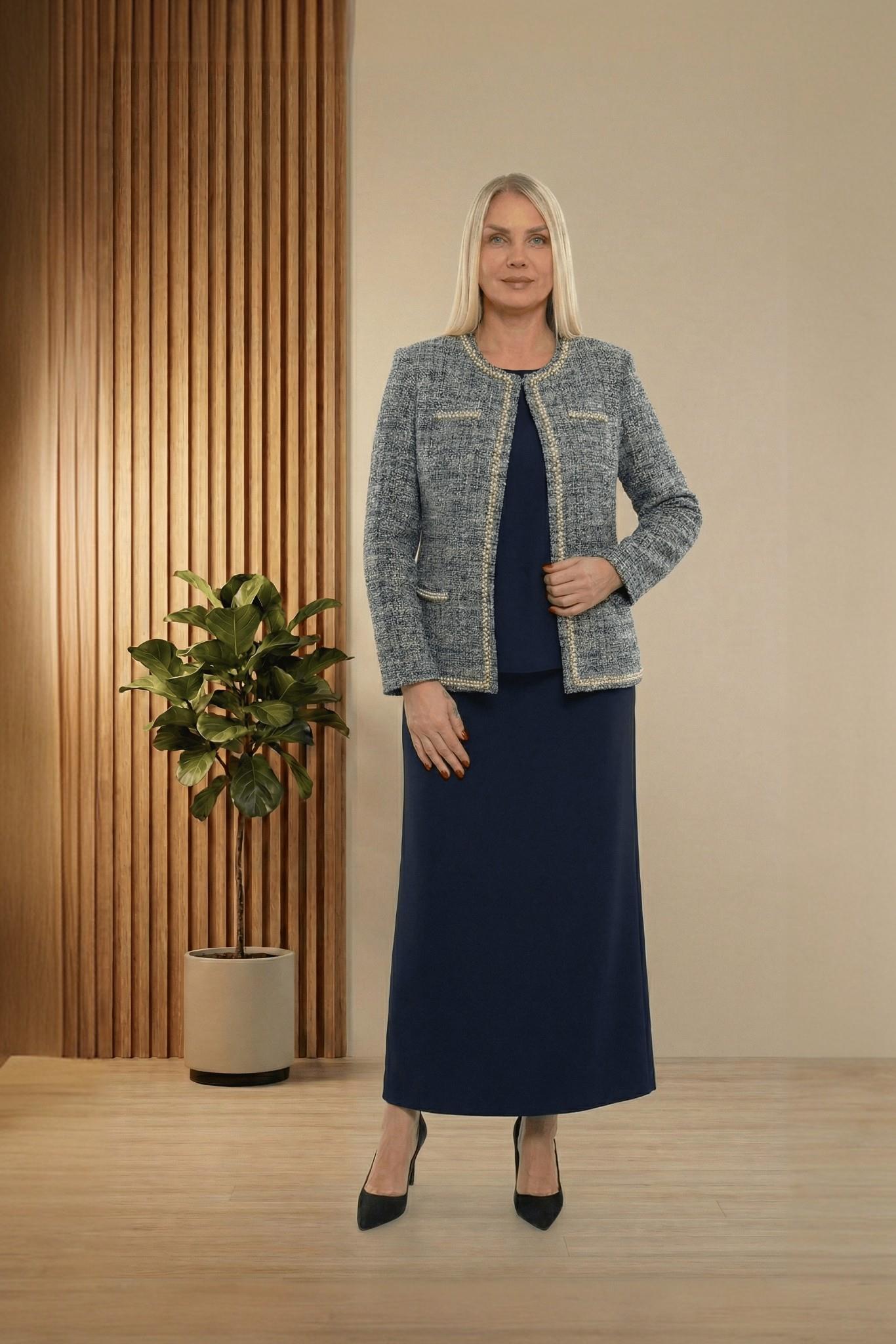 Ceketi Şık Jakar Dokumalı Taşlı Lacivert Uzun Etekli Üçlü Takım (121L)