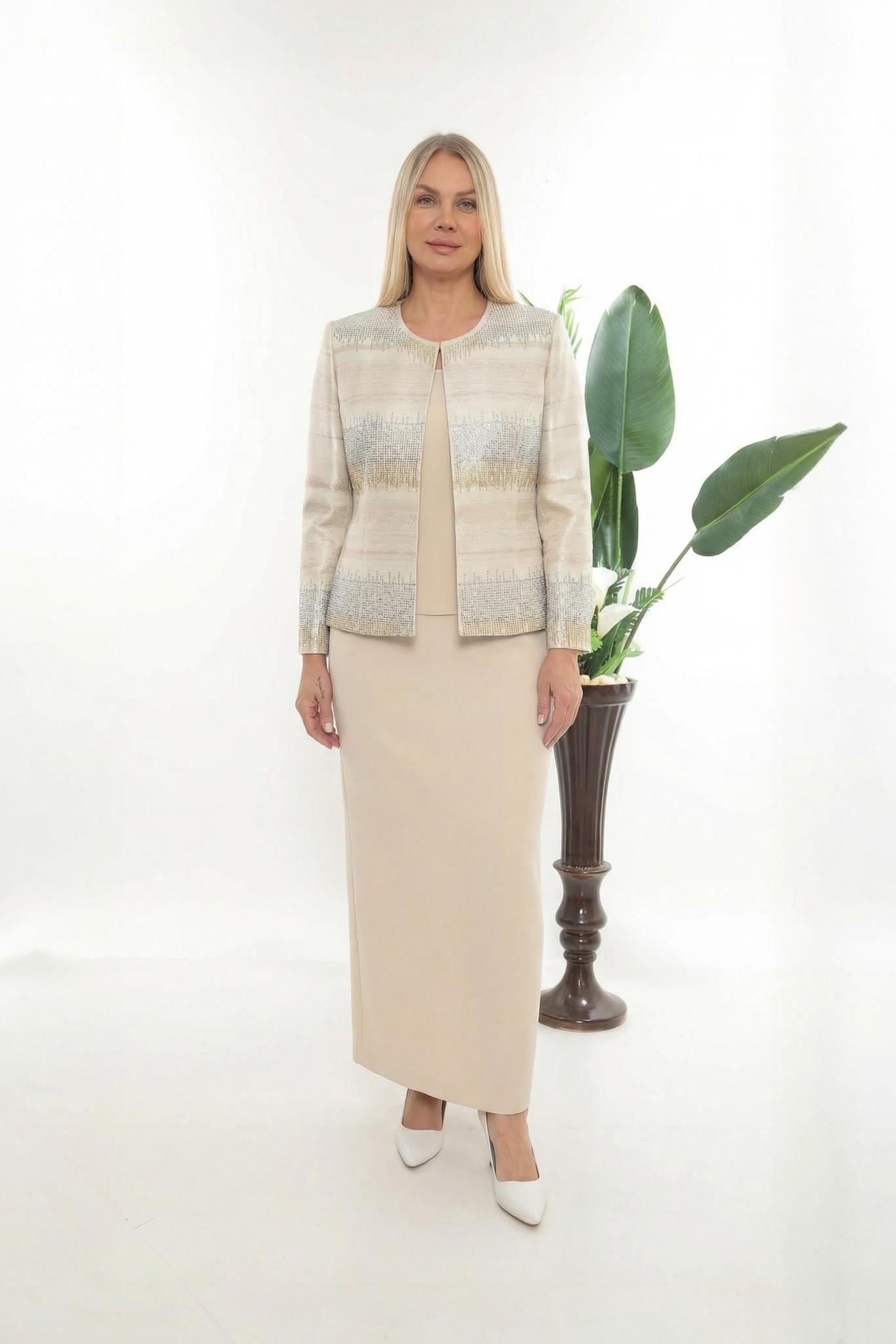 Ceketi Taş Detaylı Jakarlı Ceket İçi Kolsuz Bluz Bej Uzun Etekli Üçlü Takım (2500G)