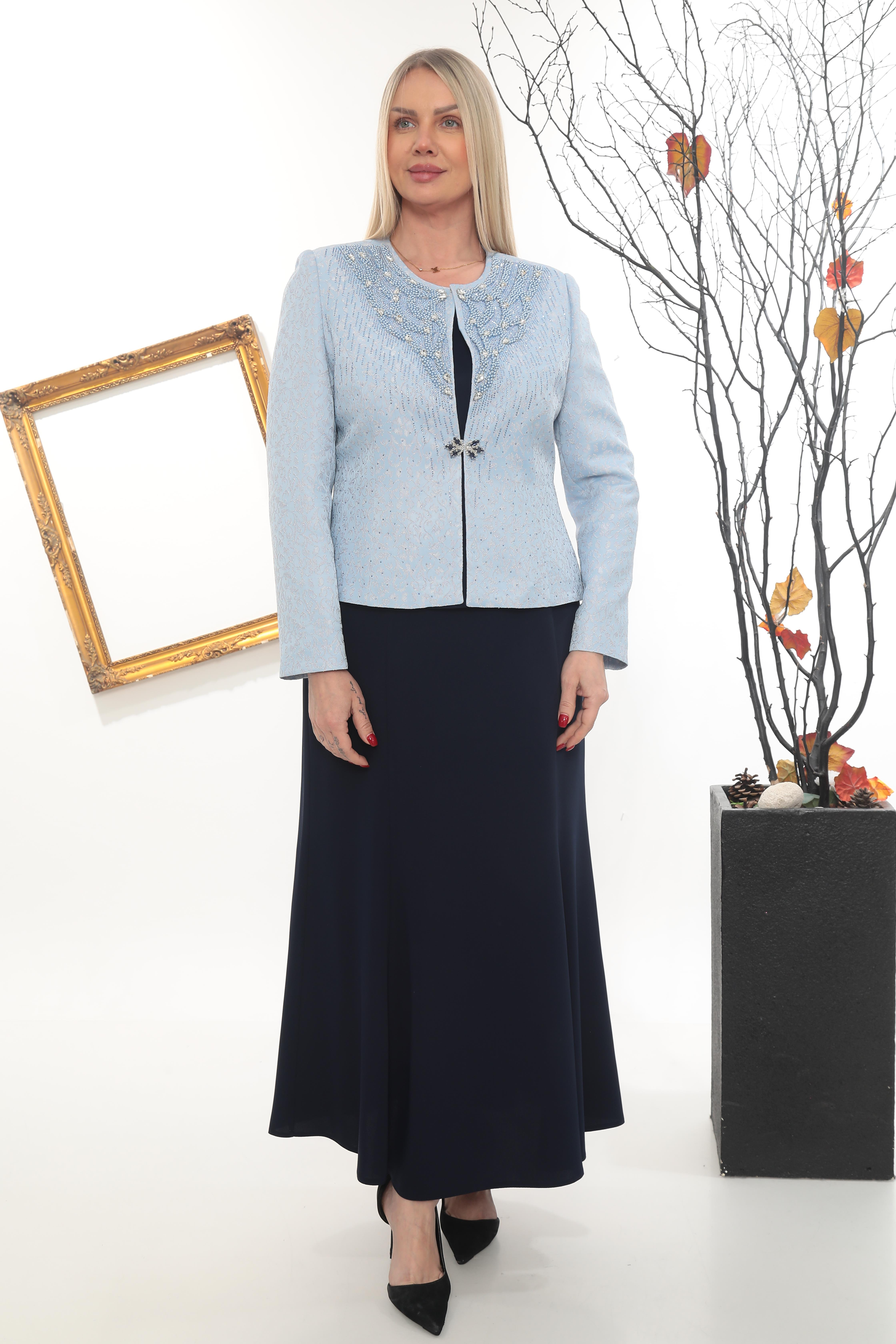 Ceketi Taş İşlemeli Astarlı Lacivert Uzun Etekli Üçlü Takım (3261L)