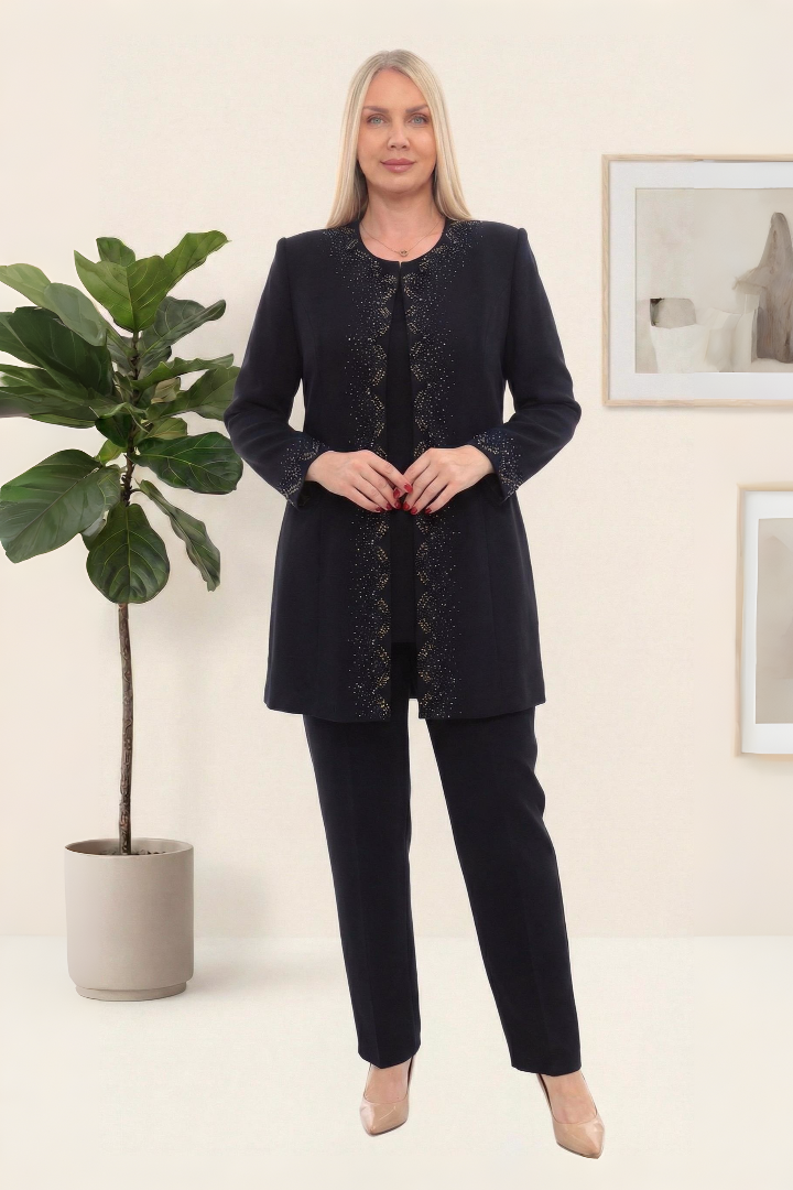 Ceketi Taş İşlemeli Astarlı Şık Siyah Üçlü Pantolonlu Takım (1702S)