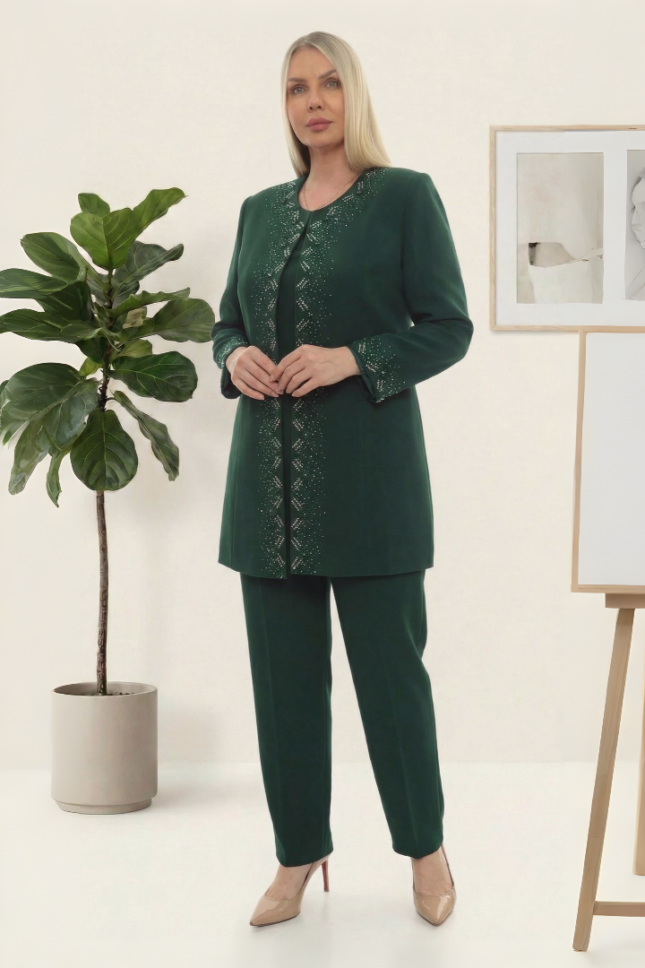 Ceketi Taş İşlemeli Astarlı Şık Yeşil Üçlü Pantolonlu Takım (1702Y)