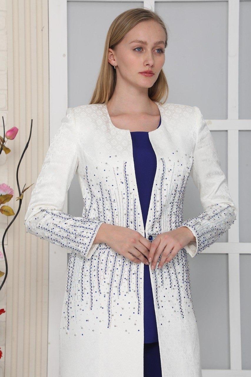 A Trouser Suit Where Elegance and Chic Come to Life in Saxon Tones! This saxon trouser suit offers a sophisticated style with the elegant look of the jacquard fabric and sparkling stone details on the jacket and sleeves. With its modern lines and special design, it's an ideal choice to reflect your style at both formal events and special occasions.