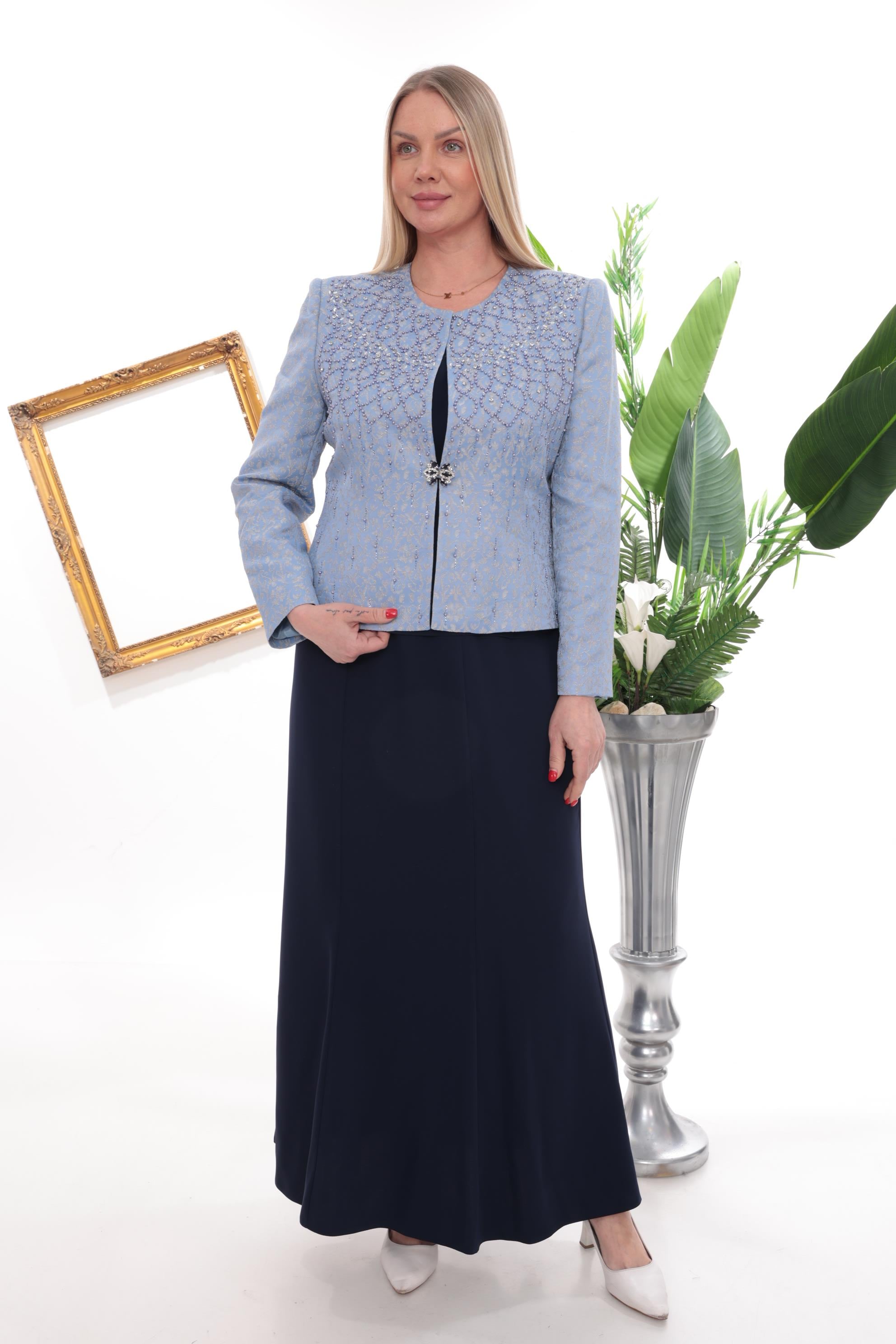 Göğüsü Ve Önü Taş İşlemeli Lacivert Uzun Etekli Üçlü Takım (J3234L)