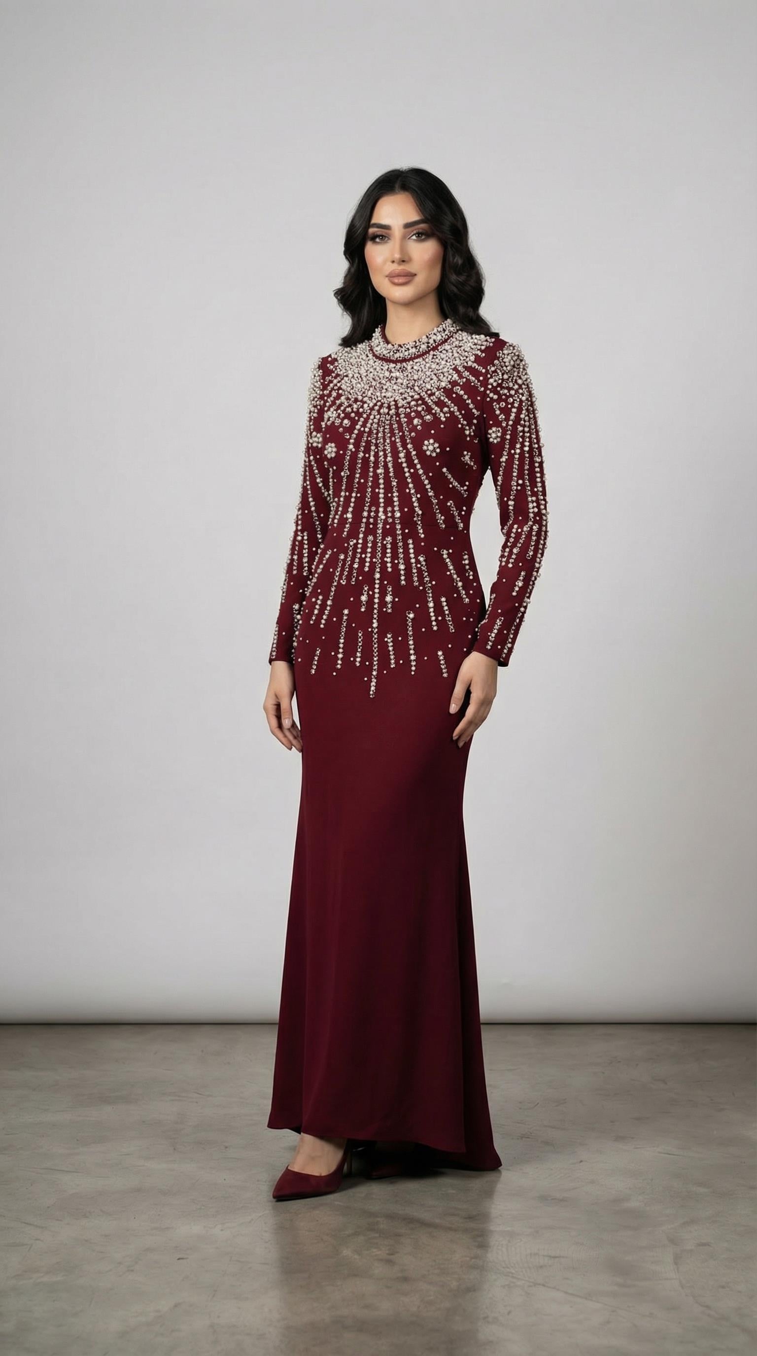 İnci ve Kristal İşlemeli Bordo Tesettür Gece Elbisesi (0741B)