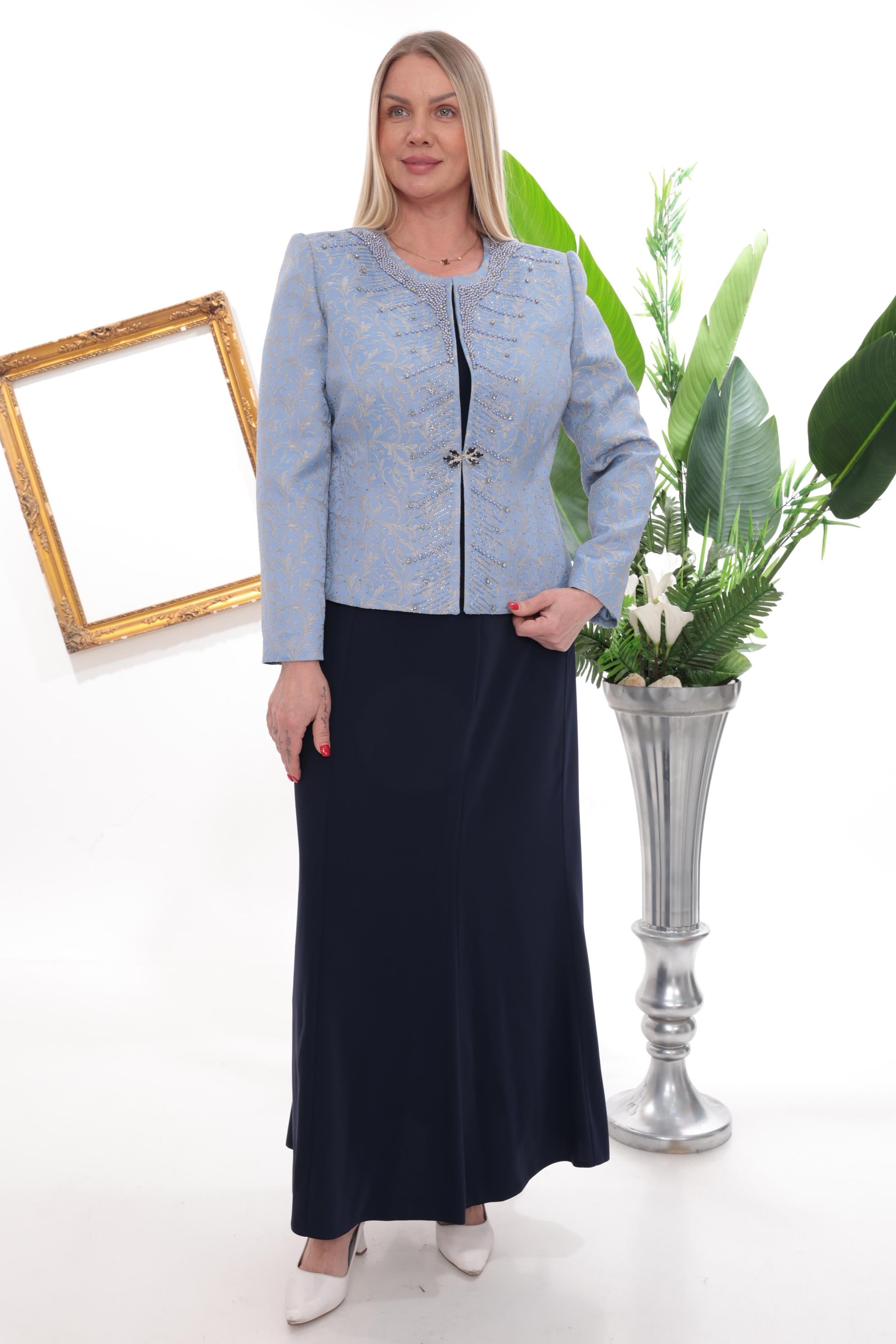 Tasarım: Barok jakar dokulu, incili ve kristal taş işlemeli lacivert üçlü takım