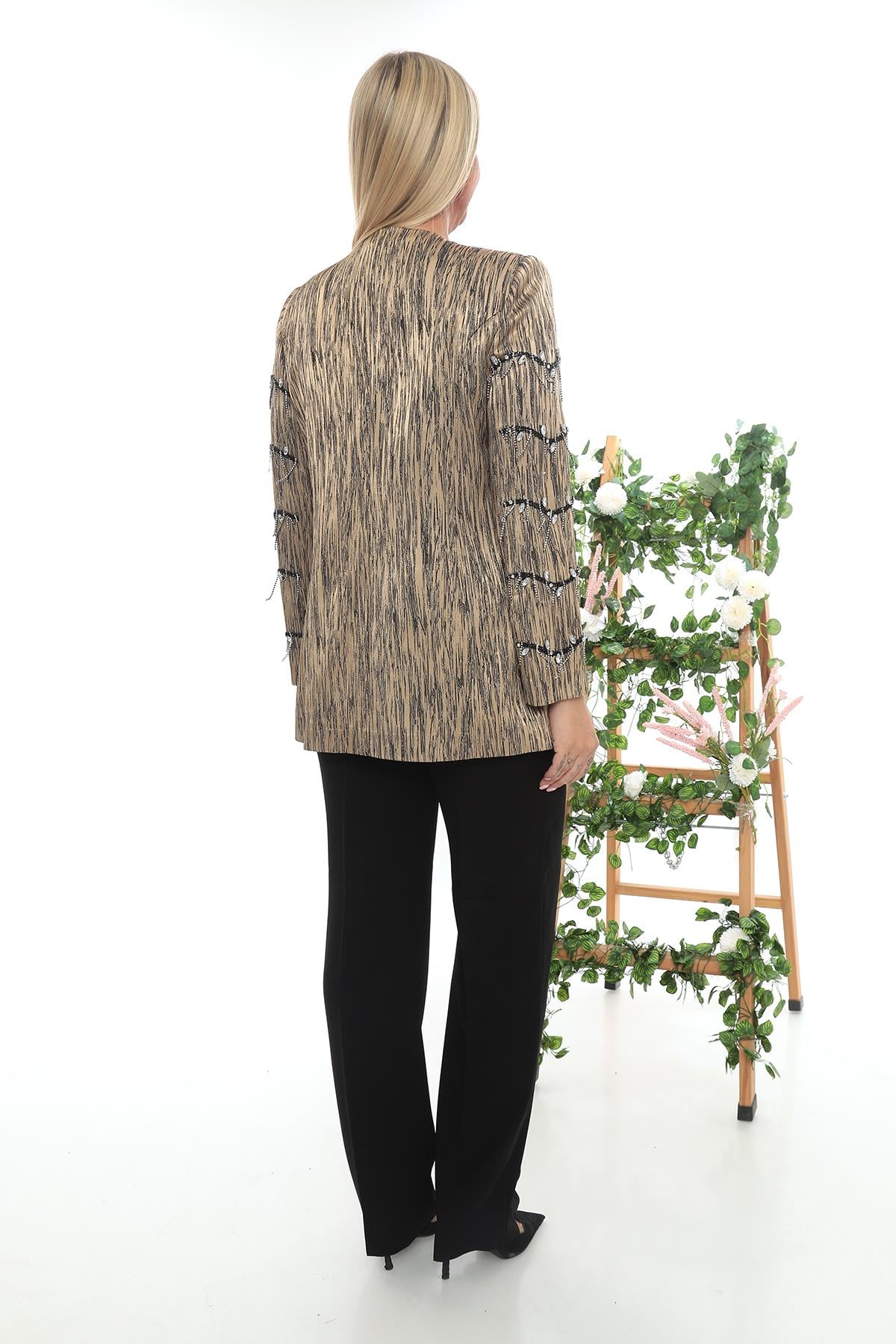 Jacket with Striped Stone Embroidery, Gold Triple-Pocket Pants Set (5870G)