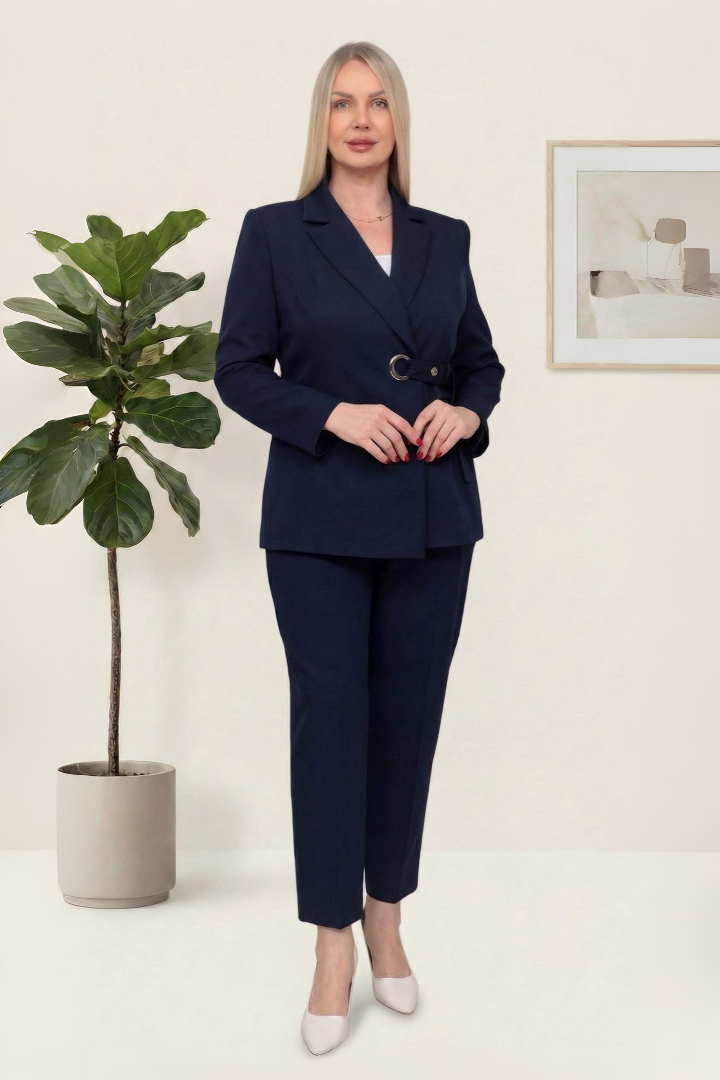 Kemar Detaylı Lacivert Sade İkili Pantolonlu Takım