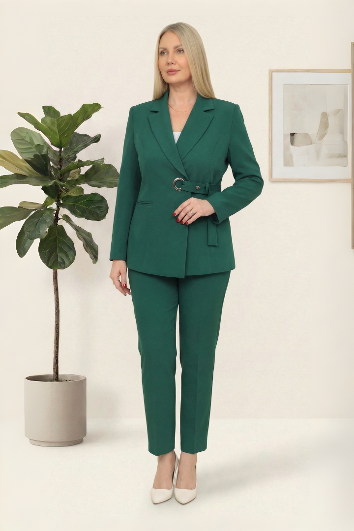 Kemar Detaylı Sade Yeşil İkili Pantolonlu Takım