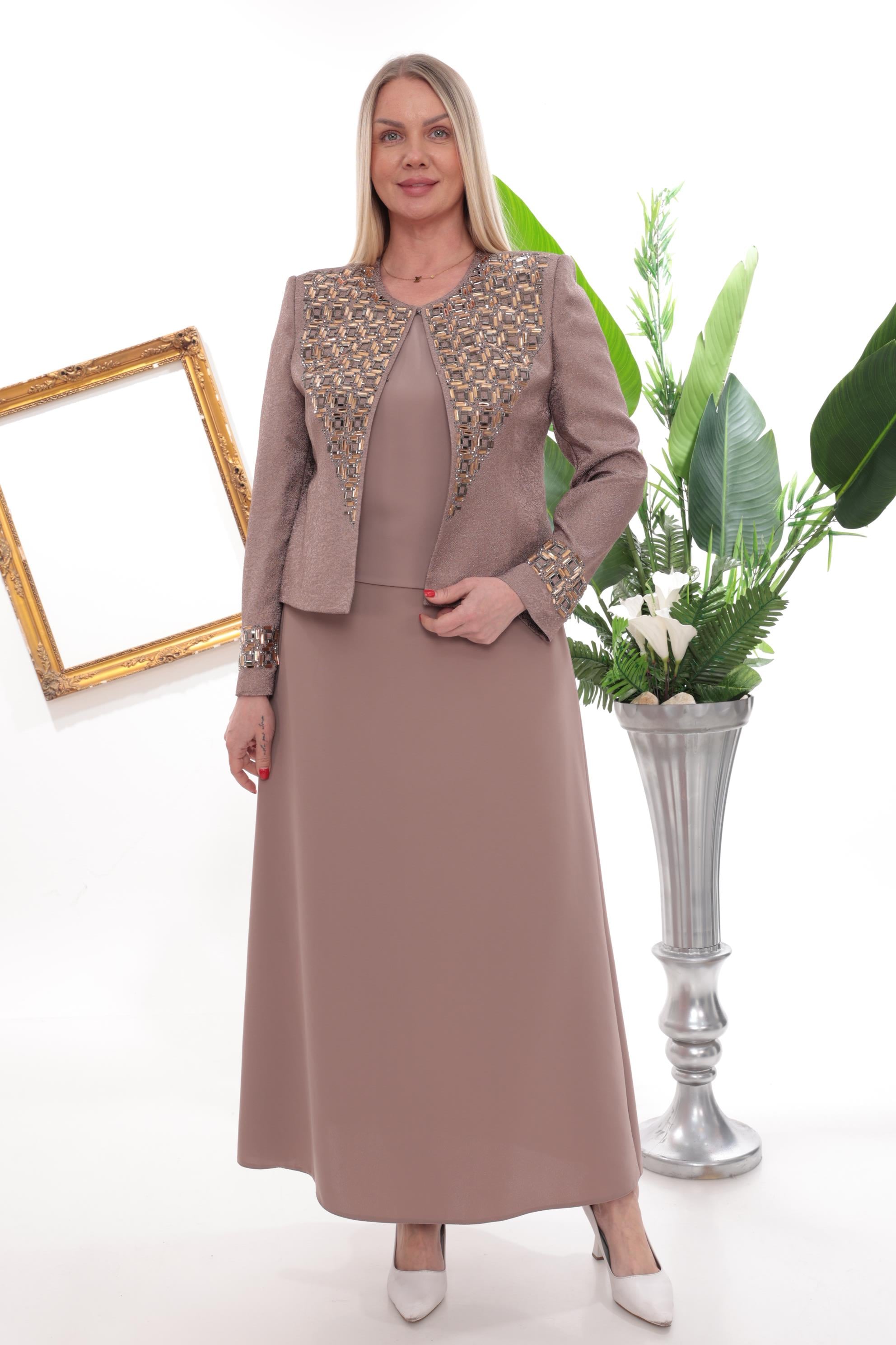 Kahverengi Asalet ve Geometrik Altın Blokların Görkemli Işıltısı Bu zarif kahverengi takım, dökümlü premium kumaşı üzerine ceketin ön paneli ve kol manşetleri boyunca işlenmiş yoğun geometrik altın blok taş detaylarıyla dikkat çeken görkemli bir tasarımdır. Büst çekiminde netleşen el işçiliği ve ışığı her açıdan yakalayan taş dizaynı, şık ceket kesimi ve takımla kusursuz bir uyum sağlayan düz lacivert iç bluz ve eteğiyle birleşerek düğünlerden en seçkin davetlere kadar her anınızda kusursuz bir asalet sunacak.