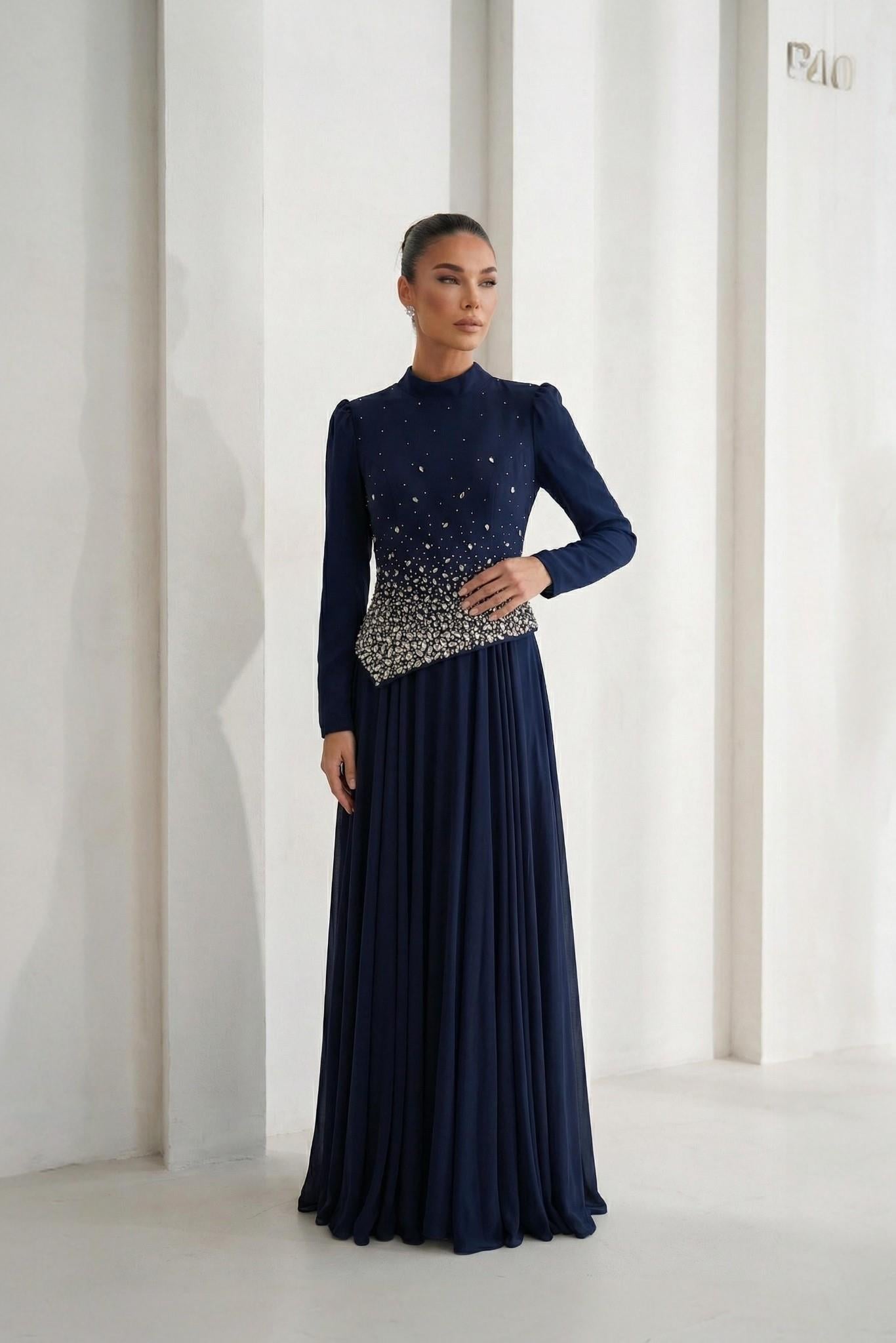 Önü Şık Taş İşlemeli Lacivert Tesettür Uzun Abiye Elbise (0790L)