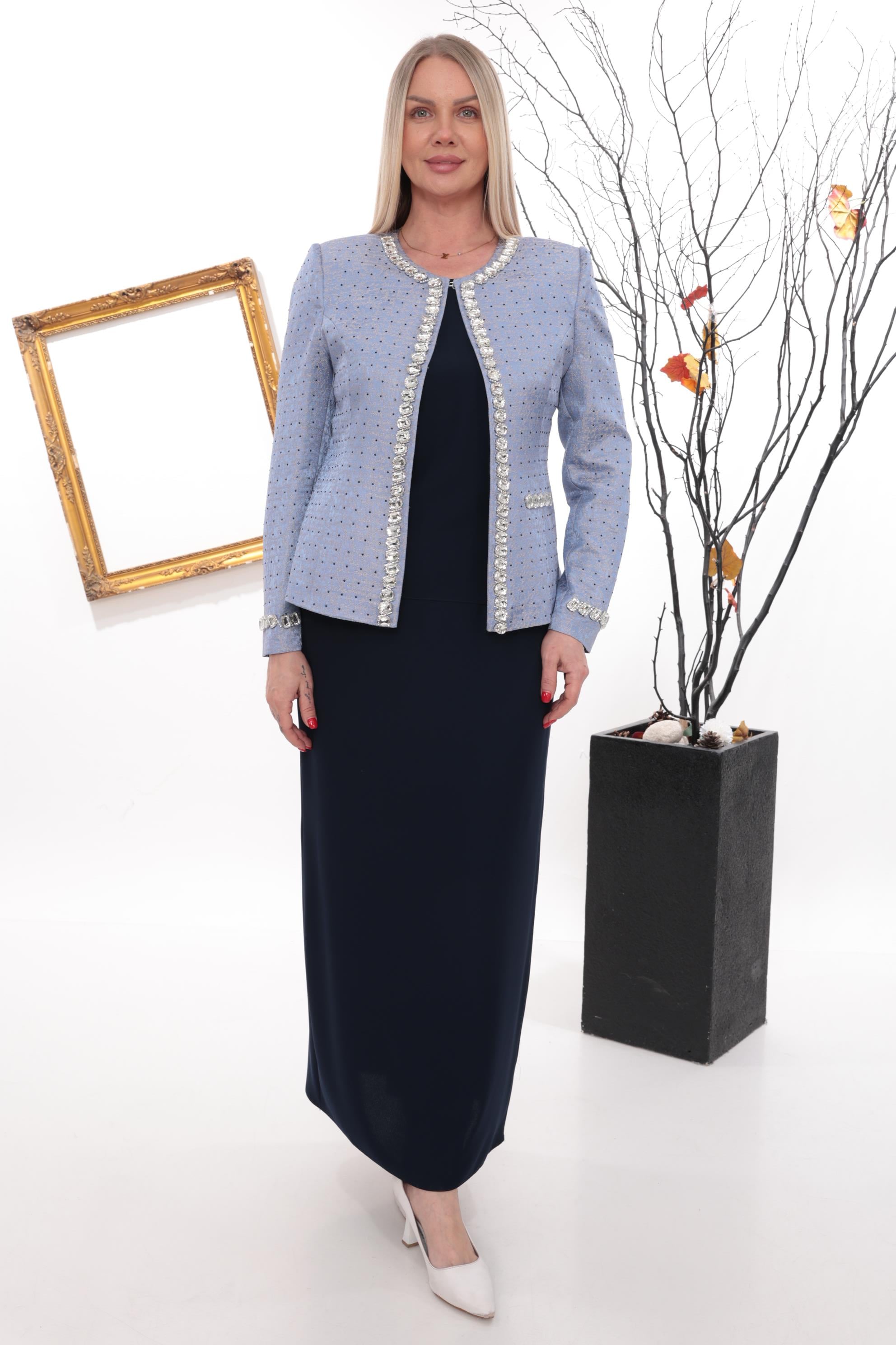 Lacivert Ferahlığı ve İri Kristallerin Görkemli Işıltısı Bu zarif lacivert takım, kendinden parıltılı lüks jakar kumaşı üzerine, hakim yaka formundaki ön panel ve kol manşetleri boyunca dizilmiş iri kristal taş detaylarıyla dikkat çeken görkemli bir tasarımdır. Büst çekiminde netleşen el işçiliği ve ışığı her açıdan yakalayan taş dizaynı, şık ceket kesimi ve takımla kusursuz bir uyum sağlayan düz iç bluz ve uzun eteğiyle birleşerek nişandan en seçkin davetlere kadar her anınızda kusursuz bir asalet sunacak.