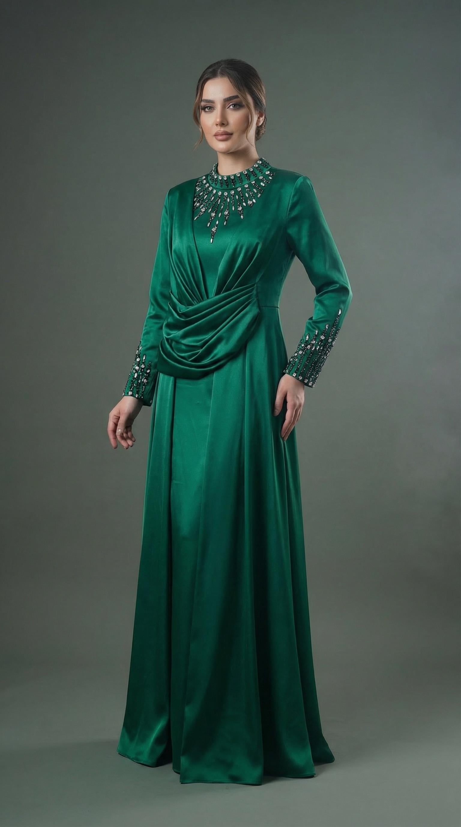Saten Dokulu Kristal Taşlı Kapalı Zümrüt Yeşili Abiye Elbise