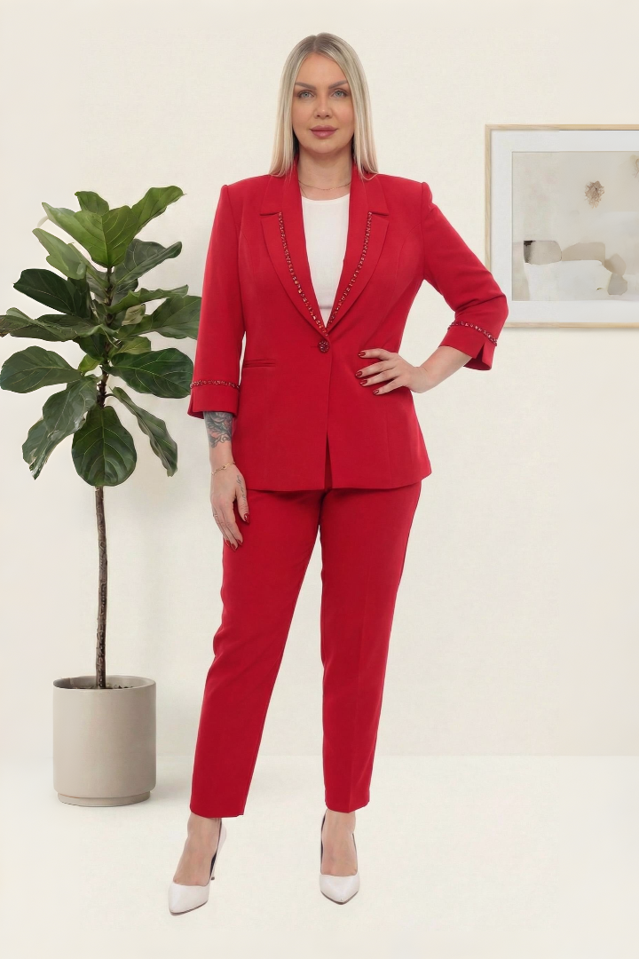 Şık Taş Detaylı Sade Zarif Kırmızı Pantolonlu İkili Takım
