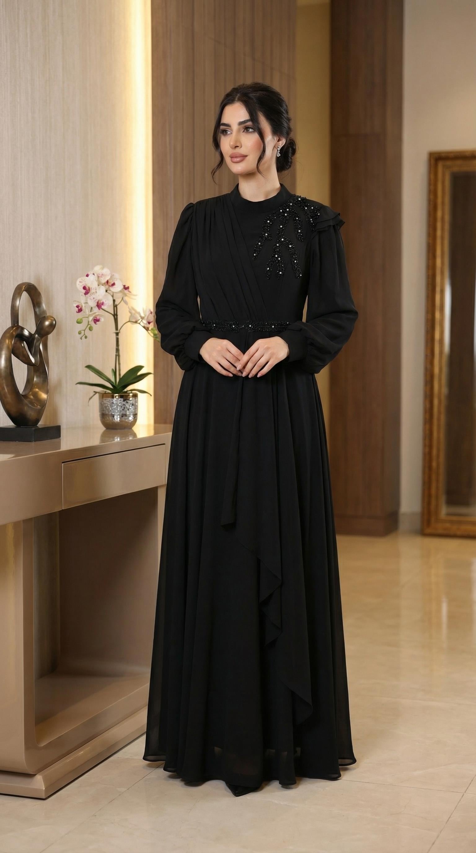 Tam Boy Taş İşlemeli Siyah Uzun Elbise (5208S)
