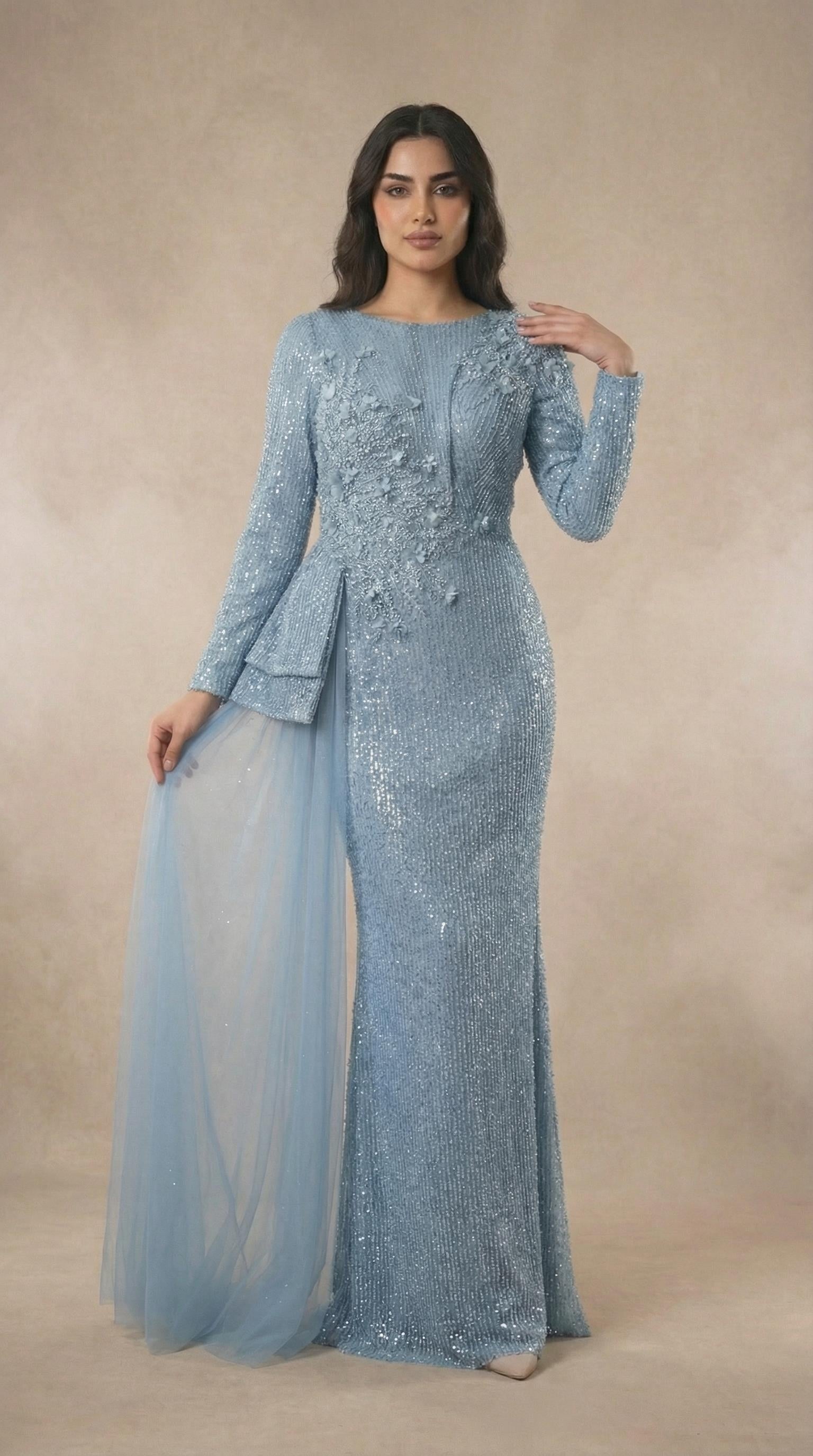 Tül Detaylı Payet İşlemeli Mavi Abiye Elbise (0747MV)