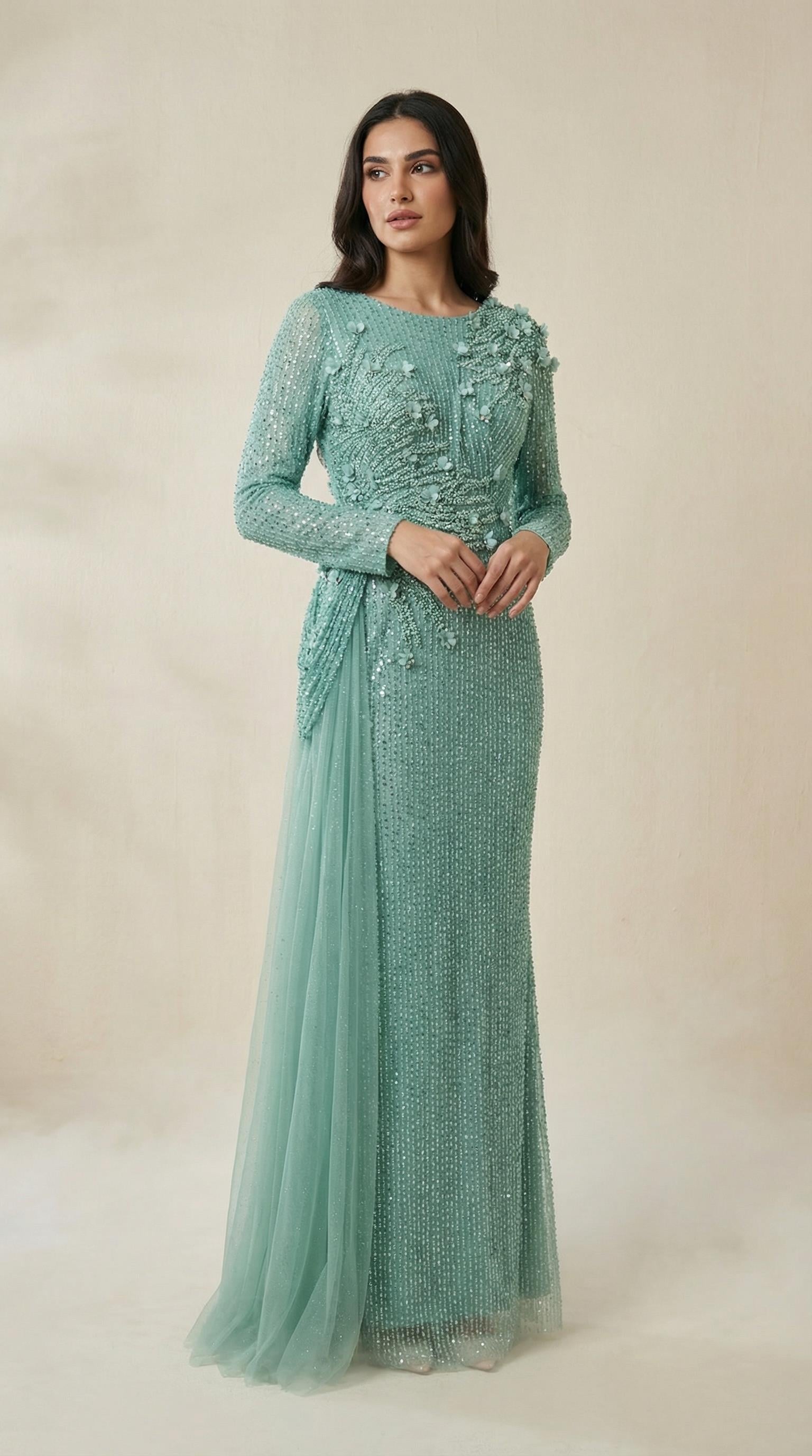 Tül Detaylı Payet İşlemeli Mint Abiye Elbise (0747MT)