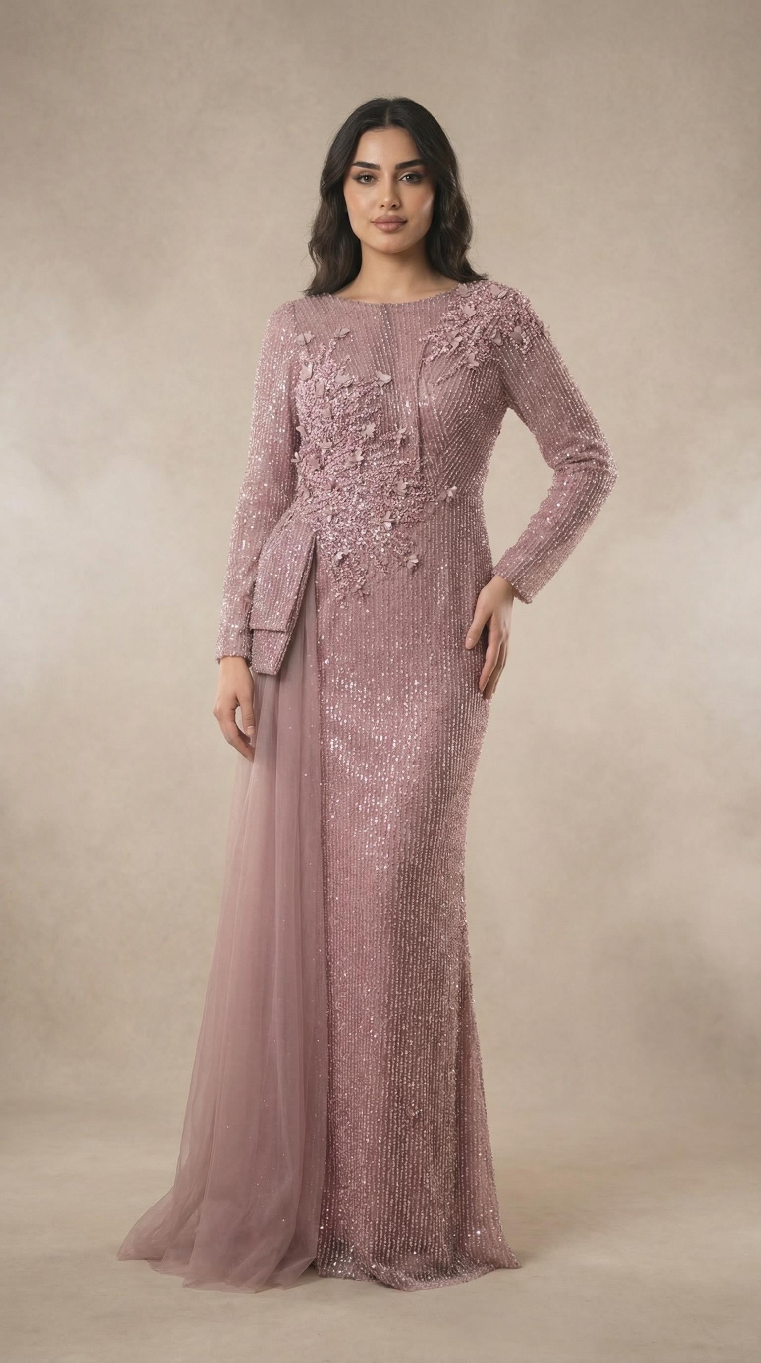Tül Detaylı Payet İşlemeli Mor Abiye Elbise (0747M)