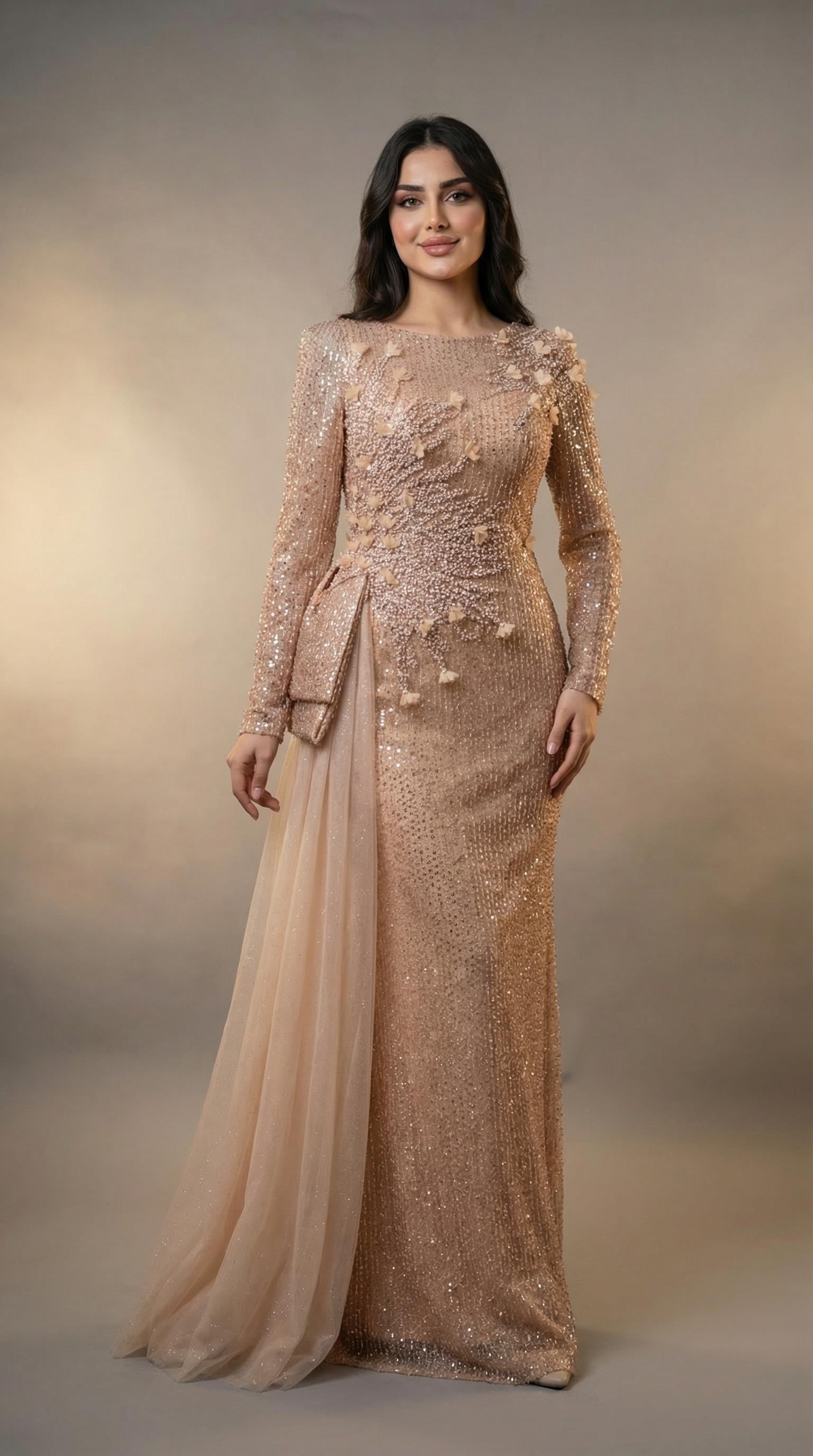 Tül Detaylı Payet İşlemeli Tesettür Abiye Elbise