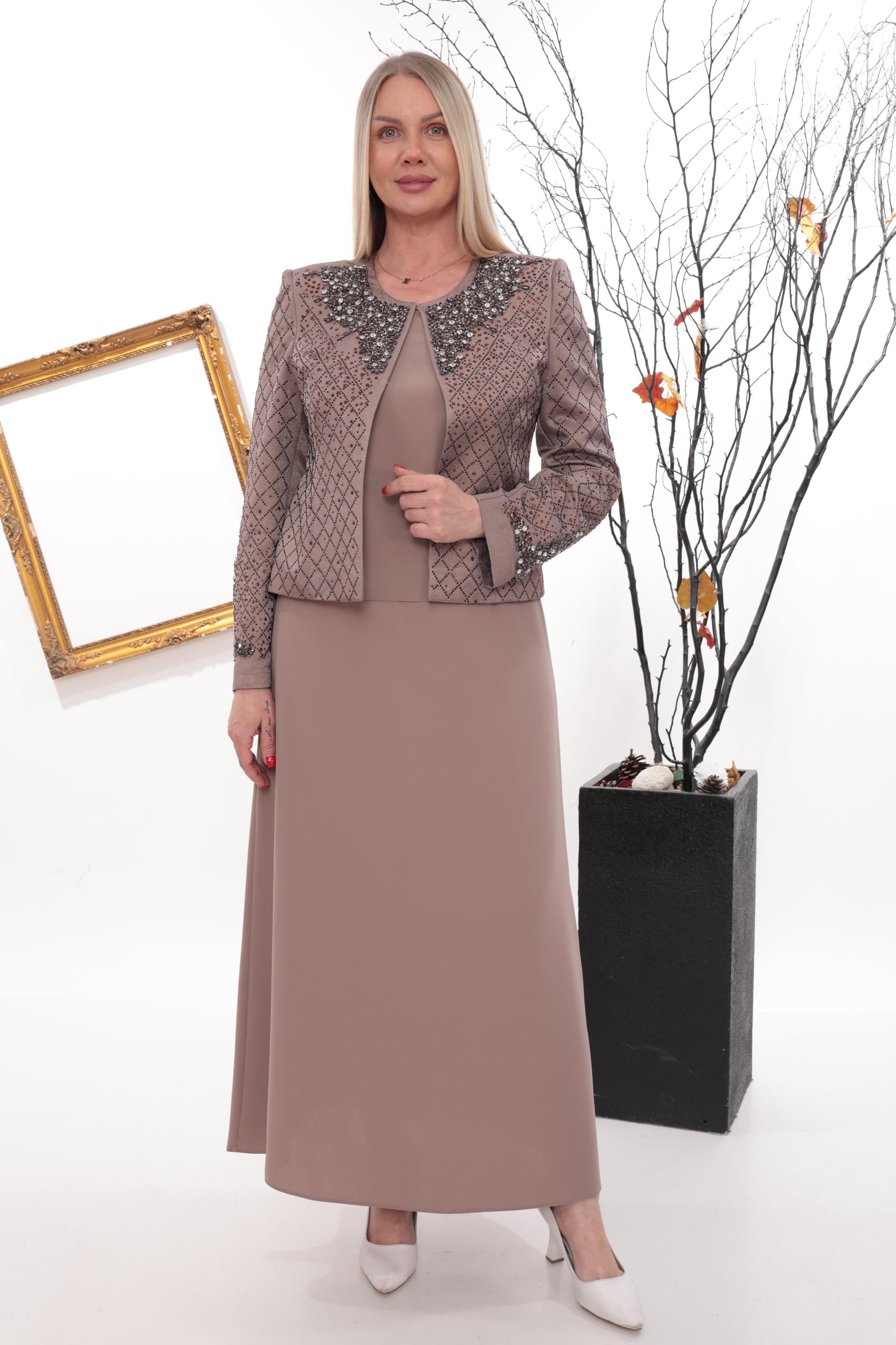 Yaka ve Kolu Şık Kristal Taş İşlemeli Kiremit Uzun Etekli Üçlü Takım