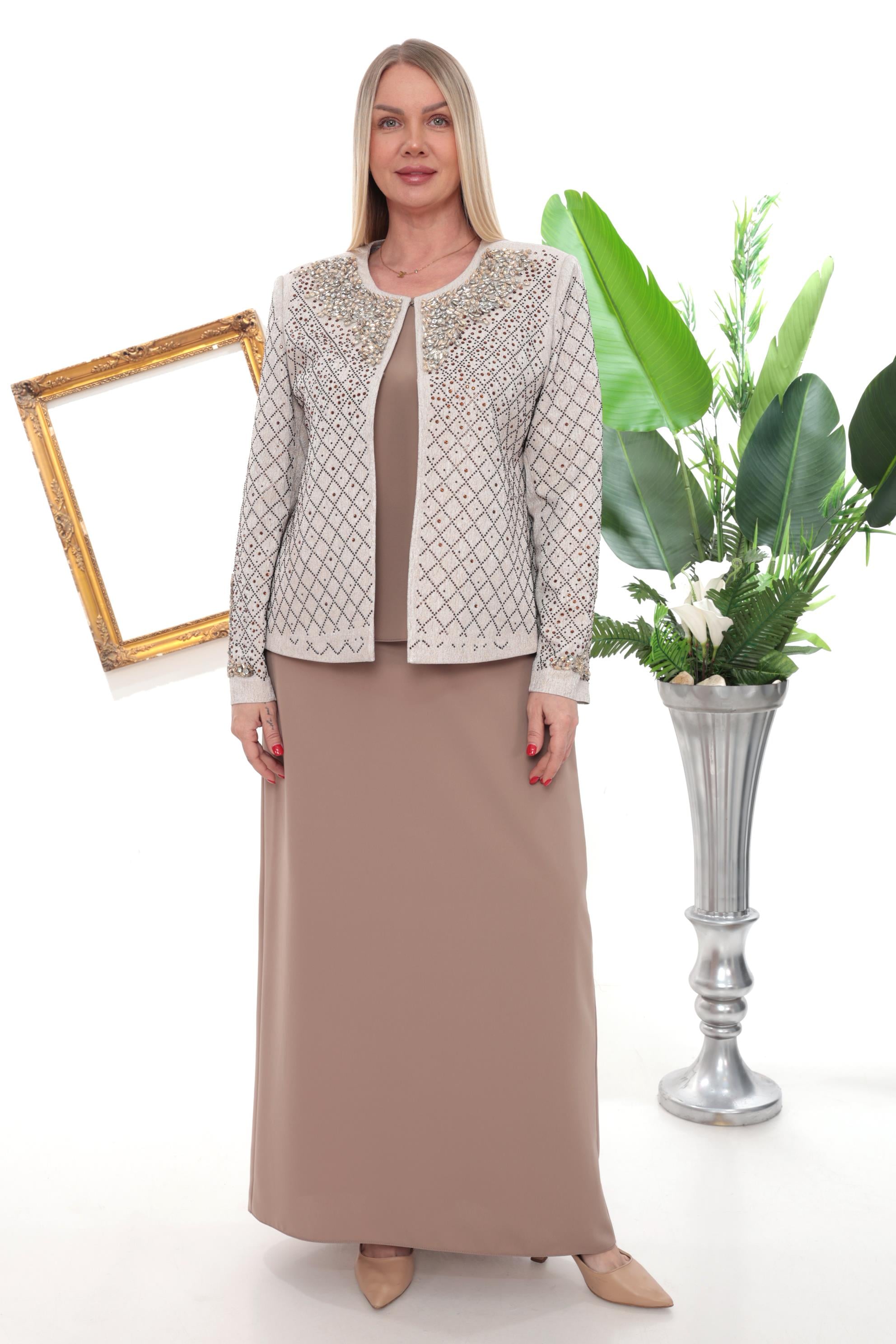 Yaka ve Kolu Şık Kristal Taş İşlemeli Vizon Uzun Etekli Üçlü Takım