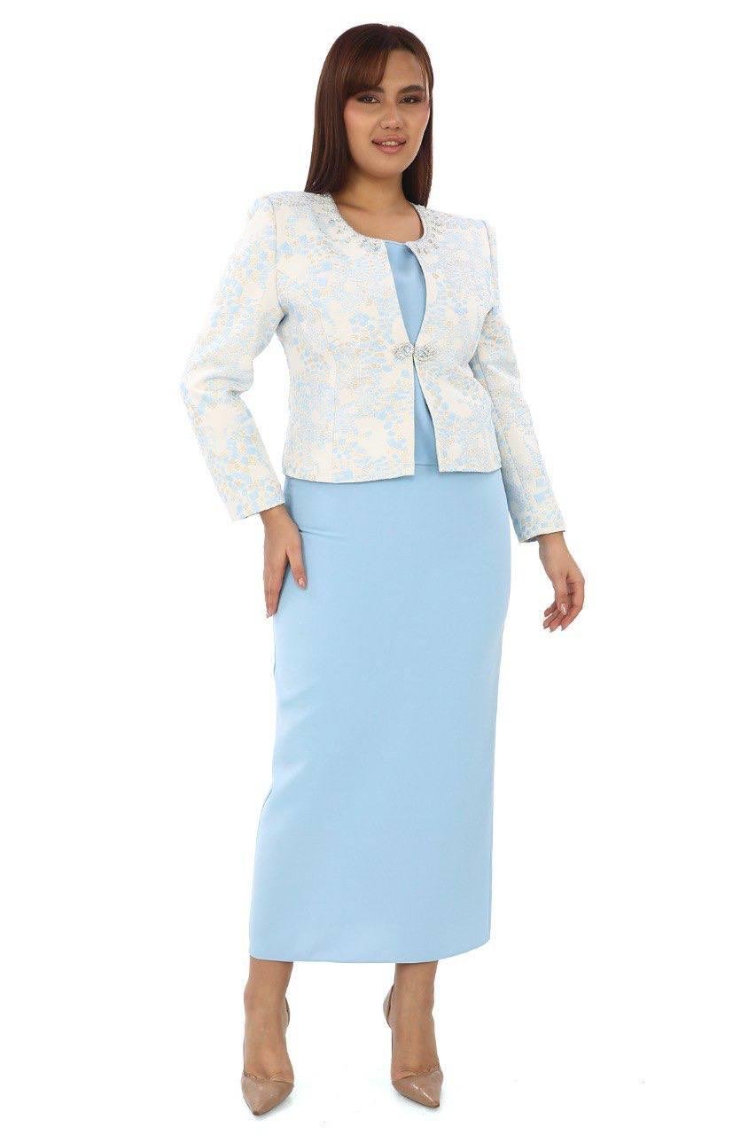Long Blue Three-Piece Set with Stone-Embroidered Collar and Jacquard Fabric (1050M)