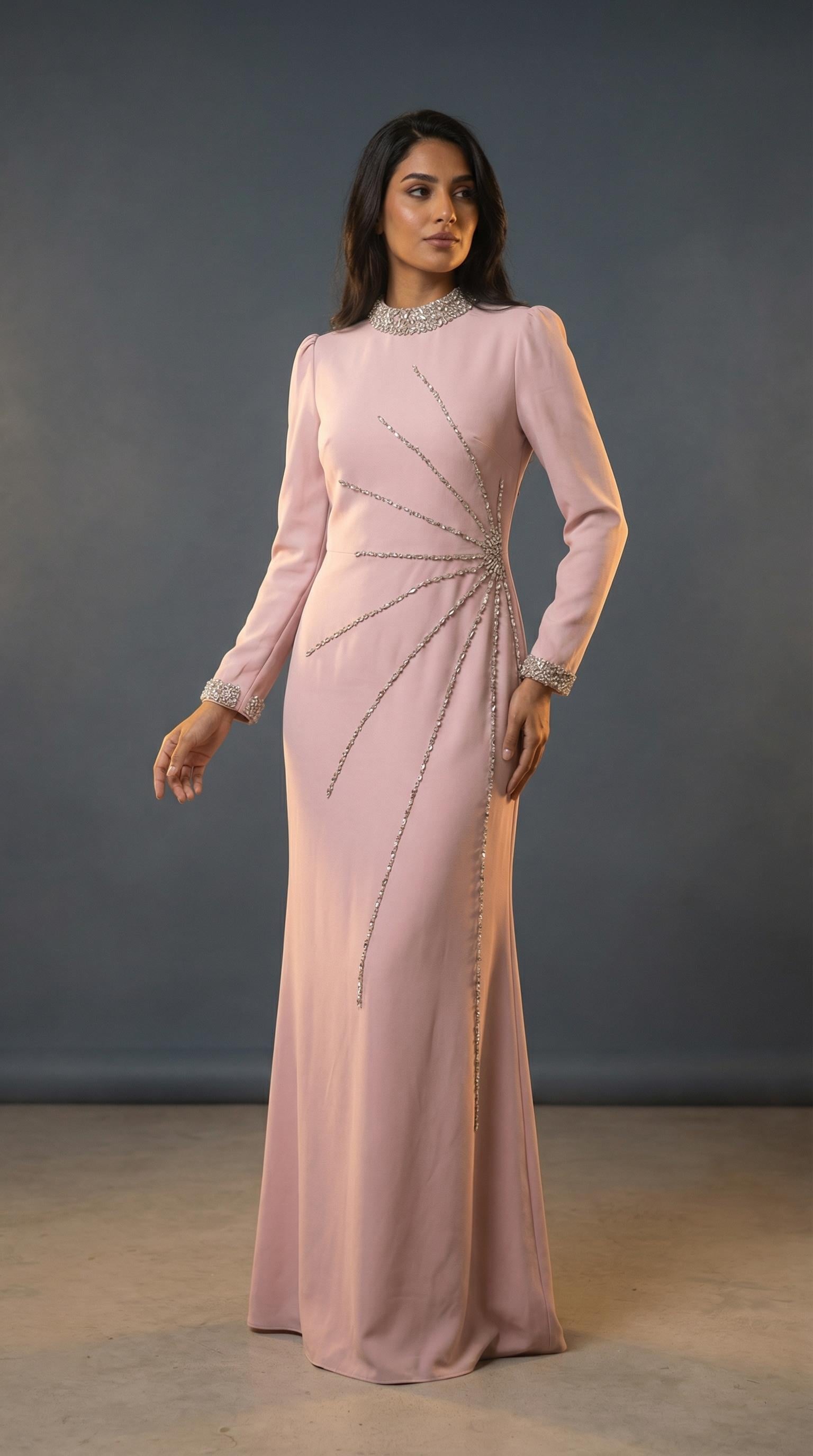 Zarif Taş İşleme Detaylı Tesettür Pudra Uzun Elbise