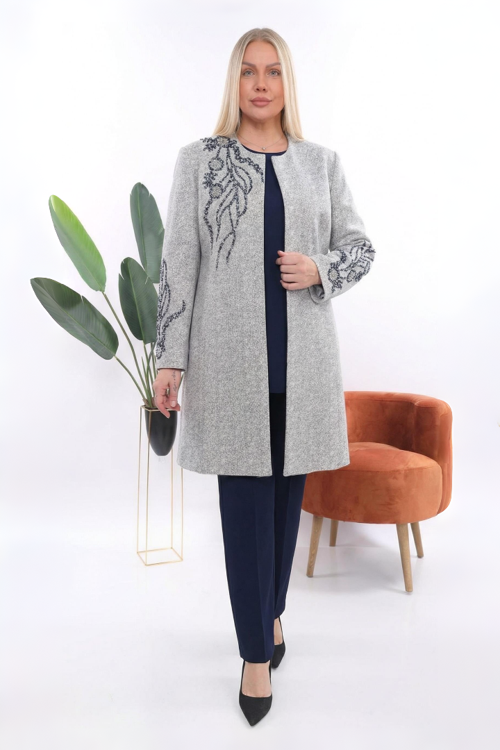 Zarif Taş İşlemeli Büyük Beden Lacivert Üçlü Pantolonlu Takım (702L)