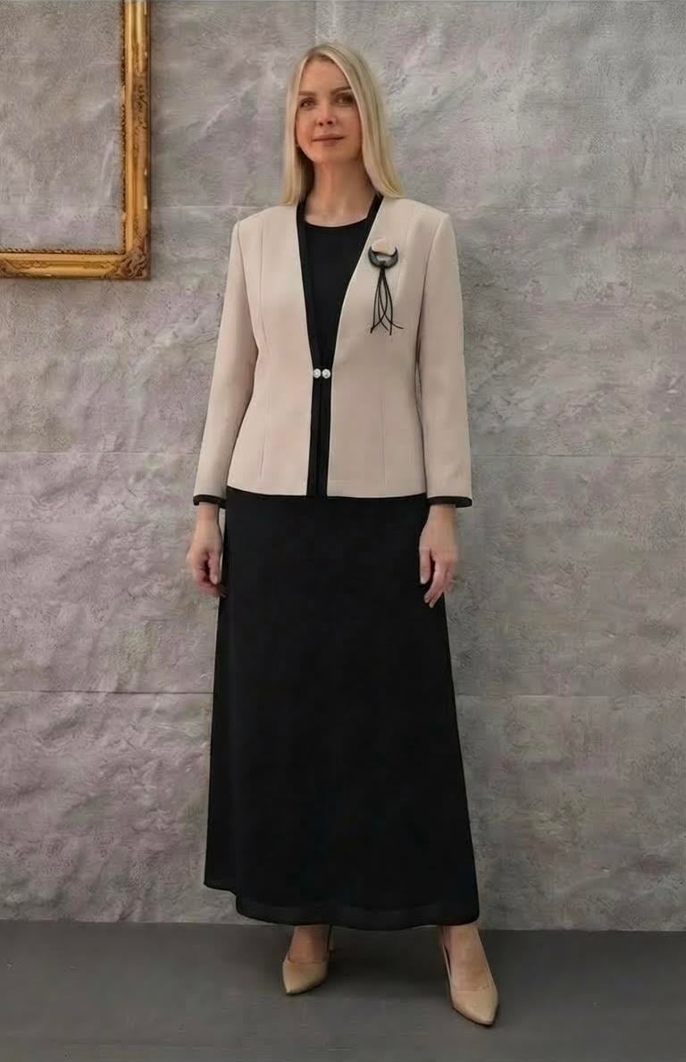 Bej ve Siyahın Uyumu, Kontrast Biyeli Asalet - Bu bej üçlü takım, yaka ve kol manşetlerindeki beyaz biye detayları ve göğüs kısmındaki şık broş aksesuarı ile dikkat çeken, klasik ve modern çizgileri birleştiren bir tasarımdır. Vücut hatlarını zarifçe saran ceketi, takımla aynı tondaki iç bluzu ve düz kesim uzun eteğiyle oluşan bu set; resmi davetlerden özel akşam yemeklerine kadar her anınızda profesyonel bir şıklık sunacak.