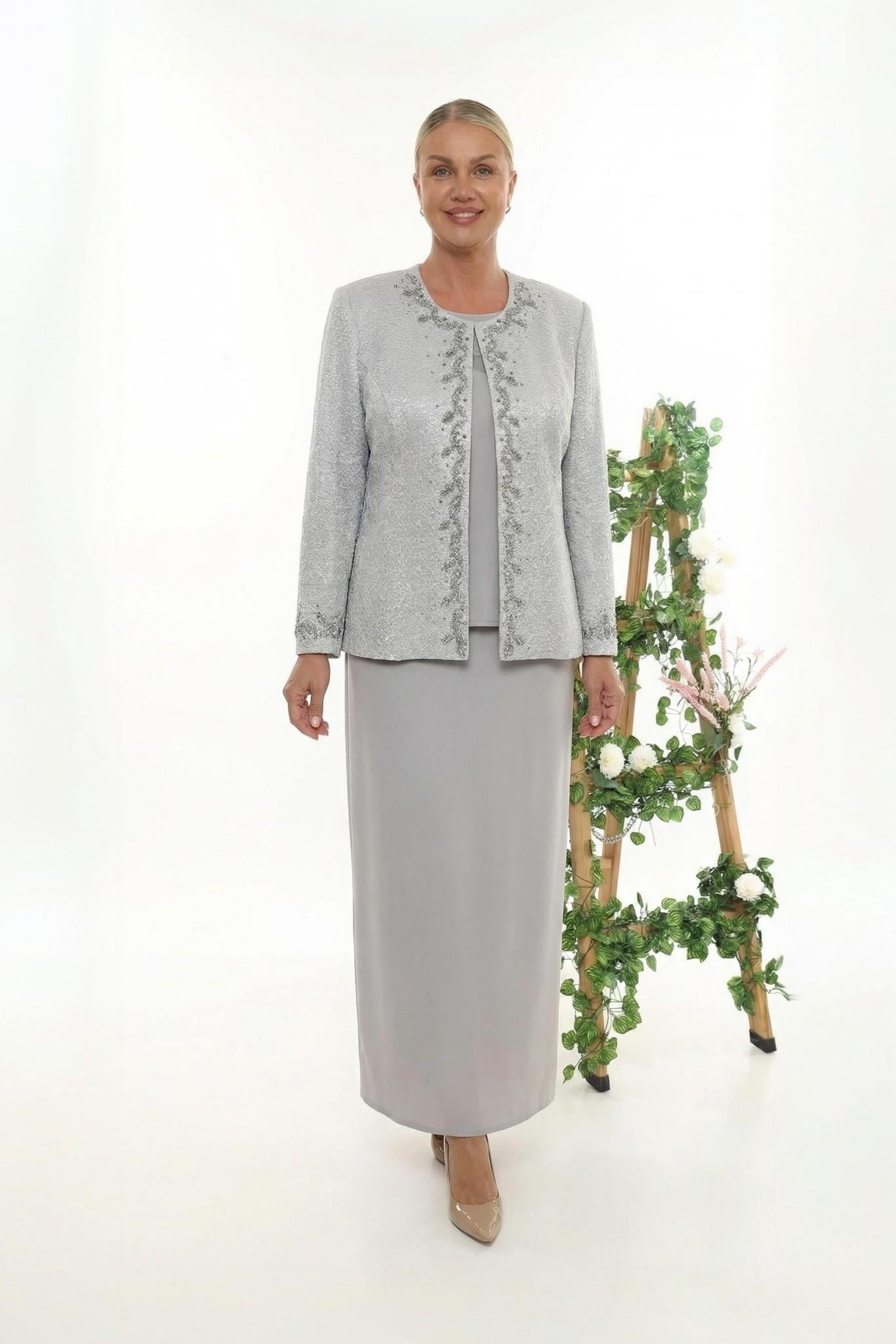 Gümüşün Büyüsü, Kristal İşleme Zarafeti - Bu gümüş gri üçlü takım, kendinden ışıltılı özel dokuma kumaşı ve yaka hattından aşağı süzülen zarif kristal işlemeleriyle dikkat çeken üst segment bir tasarımdır. Işıltılı ceketi, takımla bütünleşen düz gümüş iç bluzu ve klasik kesim uzun eteğiyle oluşan bu set; düğünlerden nişan törenlerine kadar her davette asil bir duruş sergileyecek.